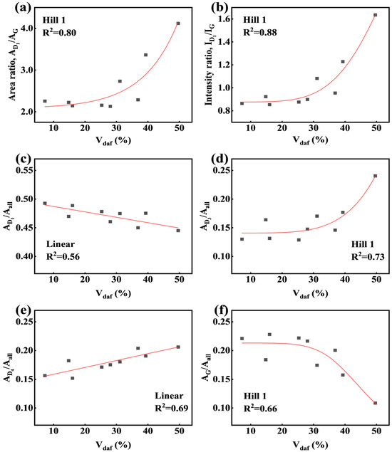 The relationships between Raman parameters of raw coals and Vdaf: (a) AD1/AG and Vdaf; (b) ID1/IG and Vdaf; (c) AD1/Aall and Vdaf; (d) AD3/Aall and Vdaf; (e) AD4/Aall and Vdaf; (f) AG/Aall and Vdaf.