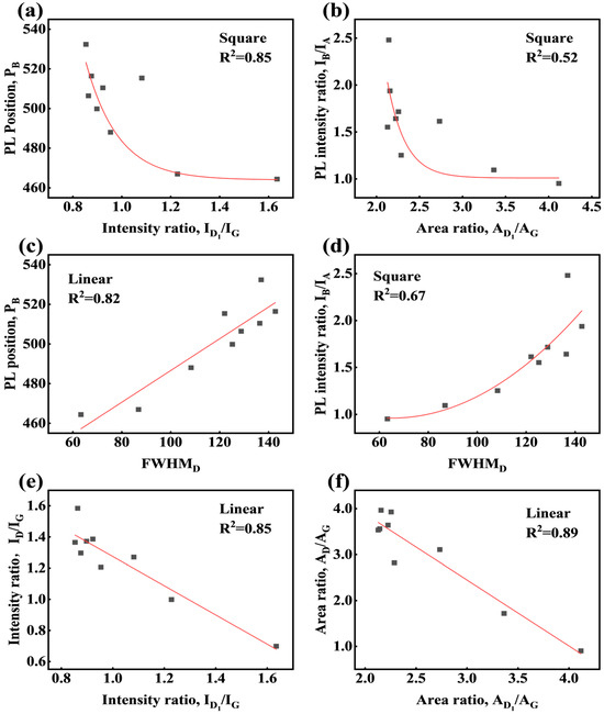 Relationships between coal-based CDs and raw coals: (a) PB position and ID1/IG; (b) IB/IA and AD1/AG; (c) PB position and FWHMD; (d) IB/IA and FWHMD; (e) ID/IG and ID1/IG; (f) AD/AG and AD1/AG.