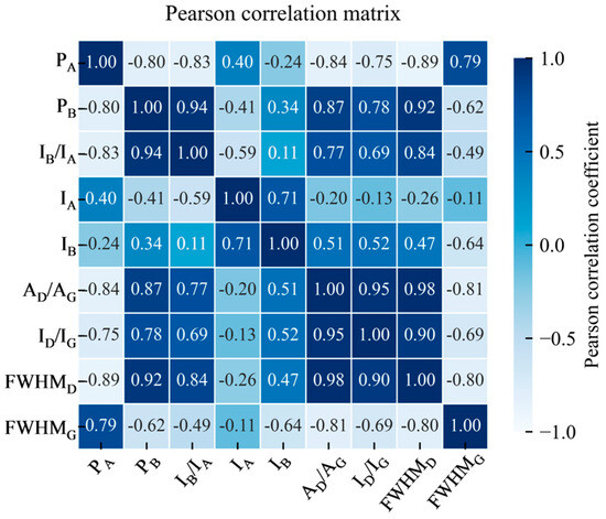 To further clarify the relationships between the PL features of coal-based CDs and the structural parameters derived from Raman, a Pearson correlation analysis was performed, as summarized in Figure 13. As shown in the correlation matrix, the emission position of Peak B exhibits strong positive correlations with defect-related Raman parameters, including AD/AG (r = 0.87), ID/IG (r = 0.78), and FWHMD (r = 0.92). These results consistently indicate that the spectral characteristics of Peak B are closely associated with the degree of structural disorder and defect density in the carbon framework, as reflected by the D band-related Raman parameters. In contrast, Peak A shows a markedly different correlation pattern. Peak A is negatively correlated with AD/AG (r = −0.84), ID/IG (r = −0.75), and FWHMD (r = −0.89), while exhibiting a strong positive correlation with FWHMG (r = 0.79). Given that FWHMG is commonly associated with variations in graphitic domain size and structural ordering, this correlation pattern suggests that Peak A is more strongly influenced by the size and confinement of sp2-conjugated domains rather than defect-related states. Notably, the weak correlations between IA and most Raman parameters further indicate that the absolute intensity of Peak A is less sensitive to defect density, whereas the relative contribution and spectral position of Peak B are strongly modulated by defect-related structural features. This correlation analysis supports a scenario in which Peak A and Peak B originate from distinct but coexisting structural motifs within the coal-based CDs. Peak A is associated with confined sp2 domains, and Peak B is strongly correlated with defect-rich and oxygen-functionalized carbon structures.