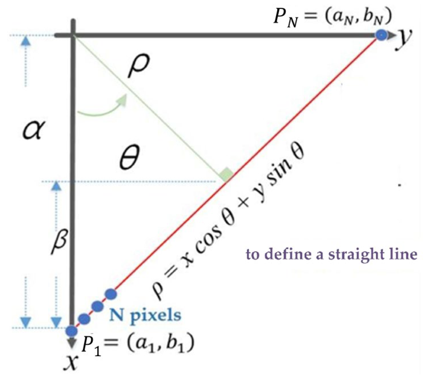 to formulate the Hough Transform problem is more appropriate, as it avoids the issue of infinite slope. In this study, the Hesse normal form is adopted to express the polar coordinate equation of a straight line, where