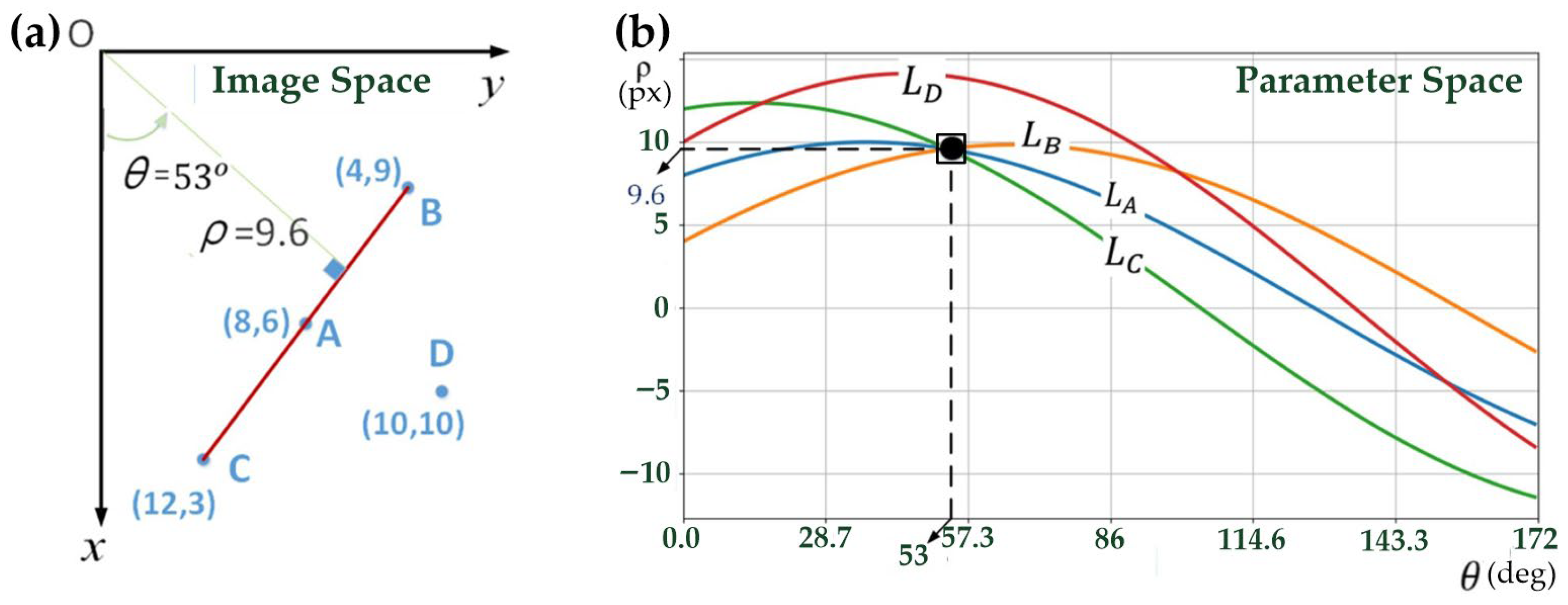 Figure 7 provides an intuitive example in both the image space and the parameter space. In the image space, four pixel points A, B, C, and D are considered, where points A, B, and C lie on the same straight line, while point D does not. When these points are transformed into the parameter space using the Hough Transform, each pixel point generates a corresponding sinusoidal curve (denoted as