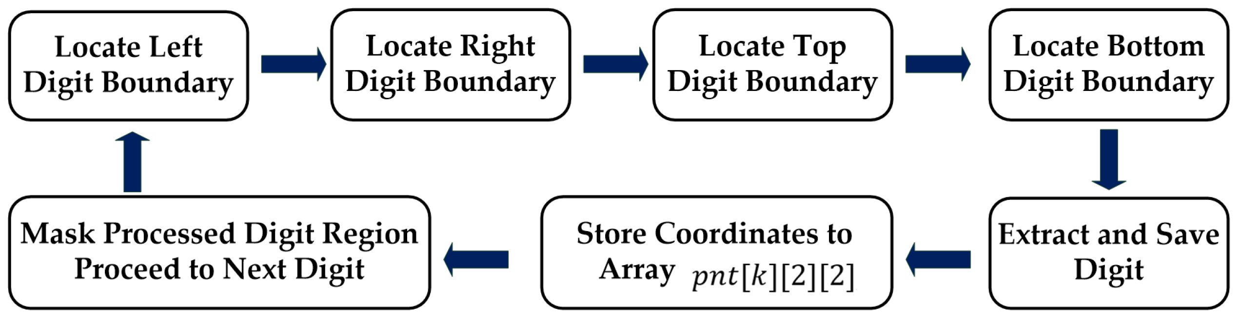 [Step VI] After extracting the digit located at the top-left corner of the image, the segmented digit is saved as an individual image file. Using the top-left (x1,y1) and bottom-right (x2,y2) coordinates, a white block of the same size is created to overwrite the extracted region in the original image. By repeating Steps I–IV, the algorithm sequentially extracts the remaining digits one by one until all have been processed.