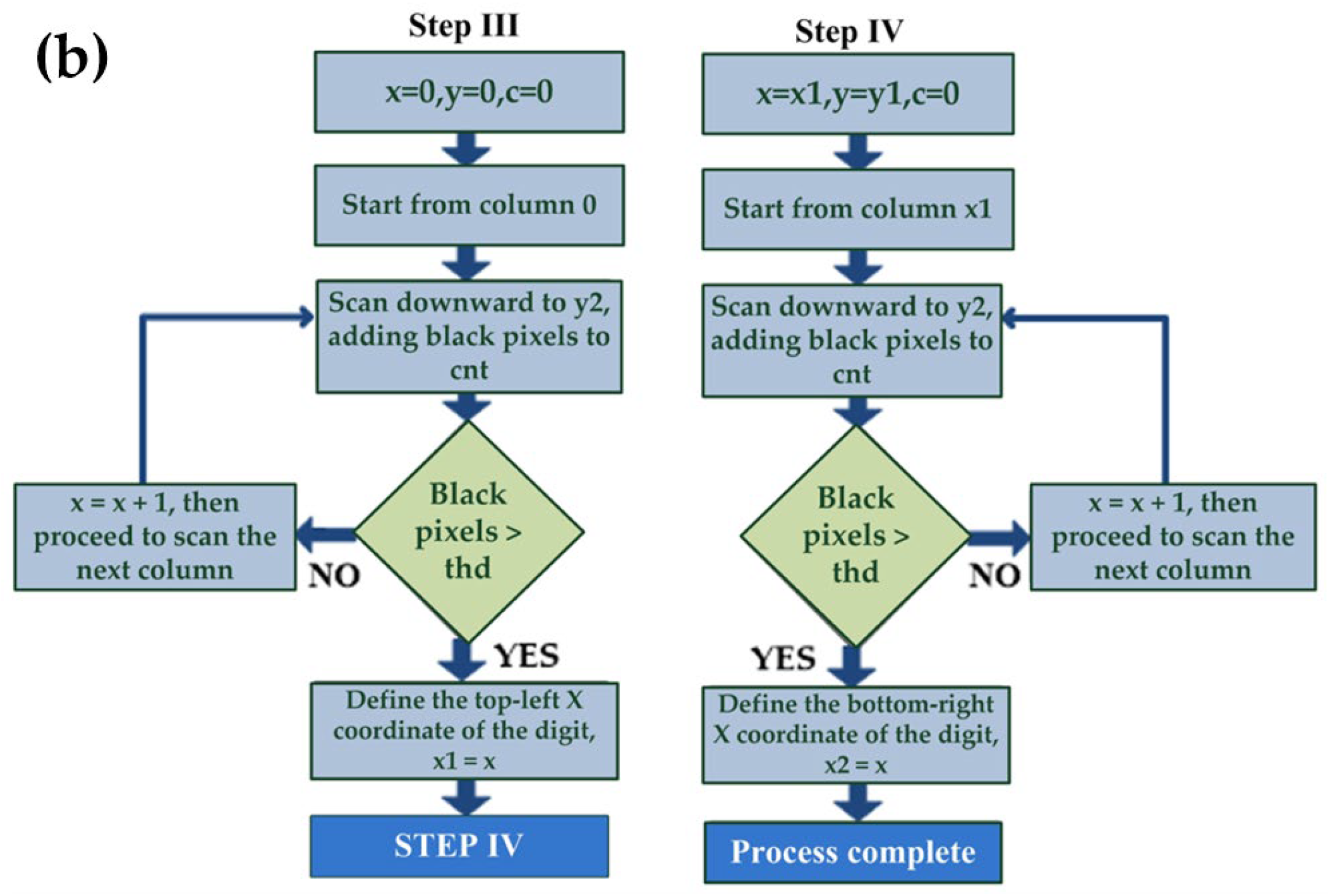 [Step III] Three variables are initialized as follows: . Scanning begins from the left side of the image and proceeds downward to the coordinate y2 (, scanning a total of pixels. If an entire vertical line contains only white pixels or the number of black pixels is less than a predefined threshold , it is assumed that no digits are present in that column, and is incremented to scan the next column. This top-to-bottom scanning process continues until a vertical line is found where the number of black pixels exceeds the threshold , indicating the presence of digits in that region. The current value is then recorded as the left horizontal coordinate of the digit block, denoted as , and the scanning is temporarily halted.