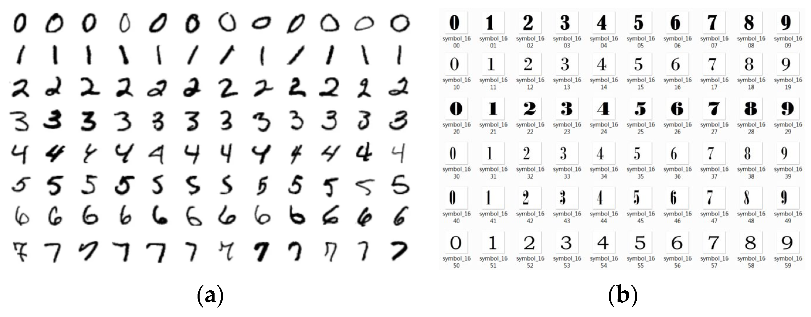 Figure 12b. The CFONT dataset consists of 4580 images generated by rendering digits 0–9 using 458 distinct TrueType/OpenType font files. For each font, one image is generated for each digit from 0 to 9, resulting in a total of 458 × 10 = 4580 images. This construction ensures systematic coverage of font-style variations while maintaining a fixed one-to-one correspondence between each font and the ten numeral classes. In this work, the digit dataset was self-constructed rather than taken from public repositories. A Python-based generator was used to render the digits, followed by alignment correction and normalization to 28 × 28 px to prepare the inputs for CNN inference. These images were then combined with the MNIST handwritten dataset to train the neural network and to evaluate its recognition accuracy under different architectural configurations.