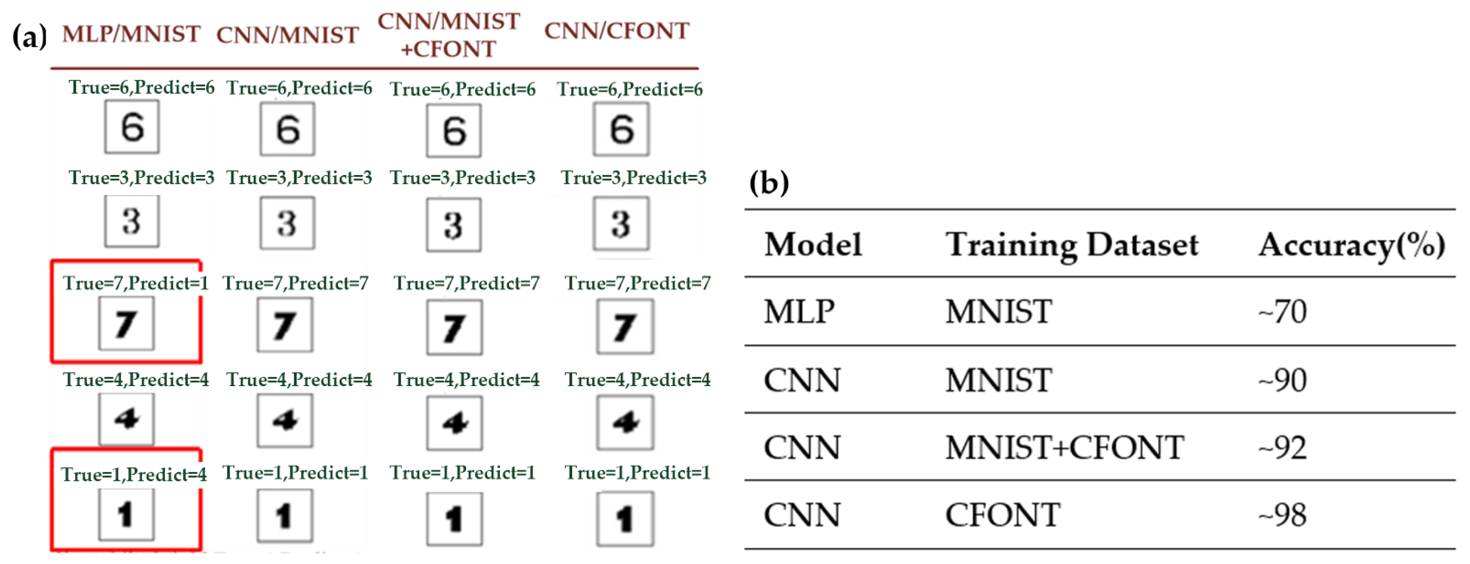 Figure 14a presents a comparative analysis of recognition performance across four training configurations: MLP (MNIST), CNN (MNIST), CNN (MNIST + CFONT), and CNN (CFONT). The table illustrates recognition results for five representative font styles—Aptos, Neue Haas Grotesk Text Pro Black, Goudy Stout, Aharoni, and BiauKai—arranged from top to bottom. As highlighted by the red boxes, the MLP model trained solely on MNIST misclassifies digits from visually similar font types (e.g., “7” as “1” and “1” as “4”). In contrast, the CNN model trained with CFONT data achieves the best performance, accurately recognizing unseen font styles and maintaining consistent predictions across diverse typographic variations.