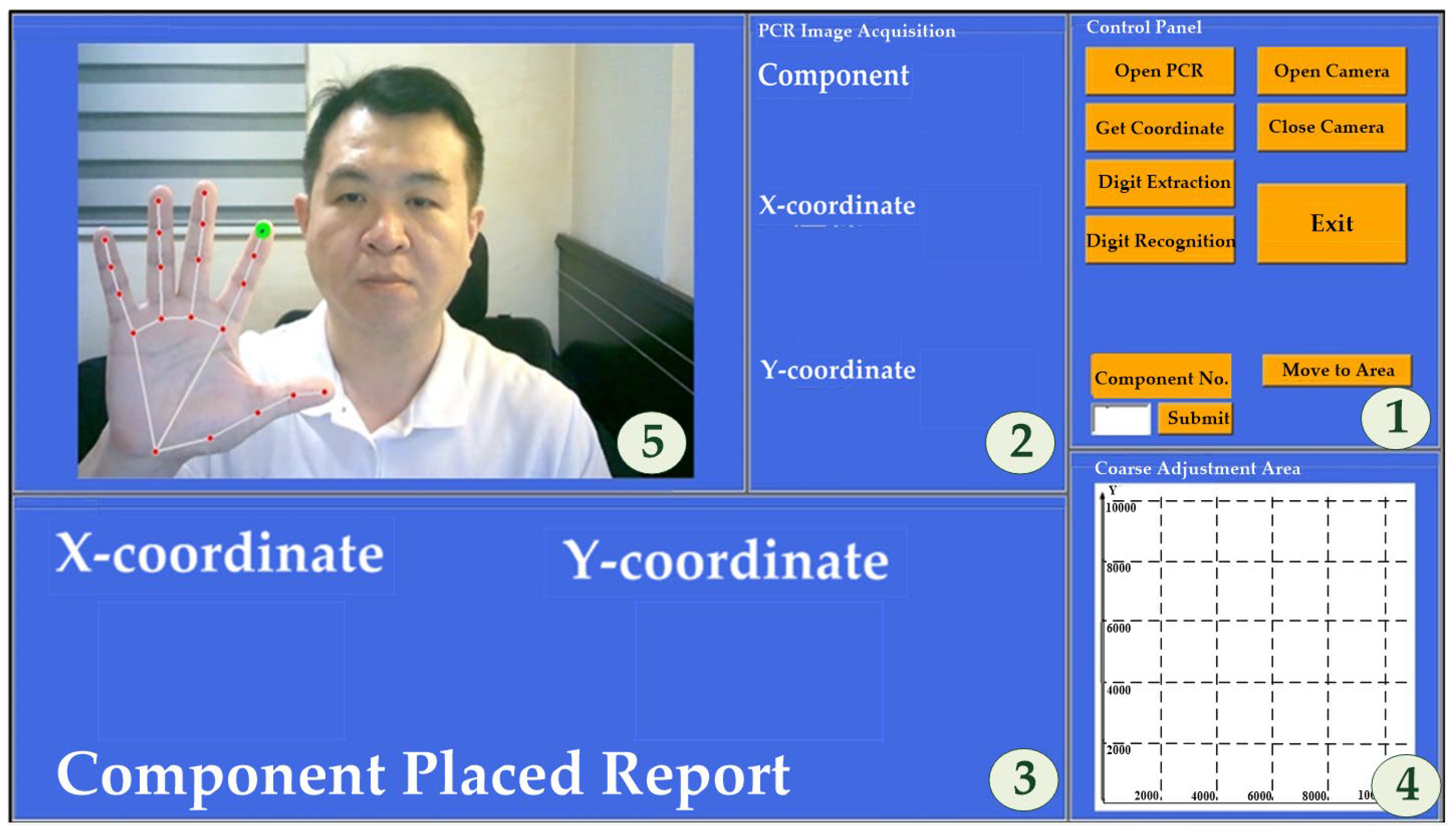 Figure 16), each dedicated to a specific system function: (1) Control Panel, (2) PCR Image Acquisition, (3) PCR Component Coordinates, (4) Coarse Adjustment Area, and (5) Fine Adjustment Gesture Recognition. The system functionalities and operational procedures are summarized as follows.