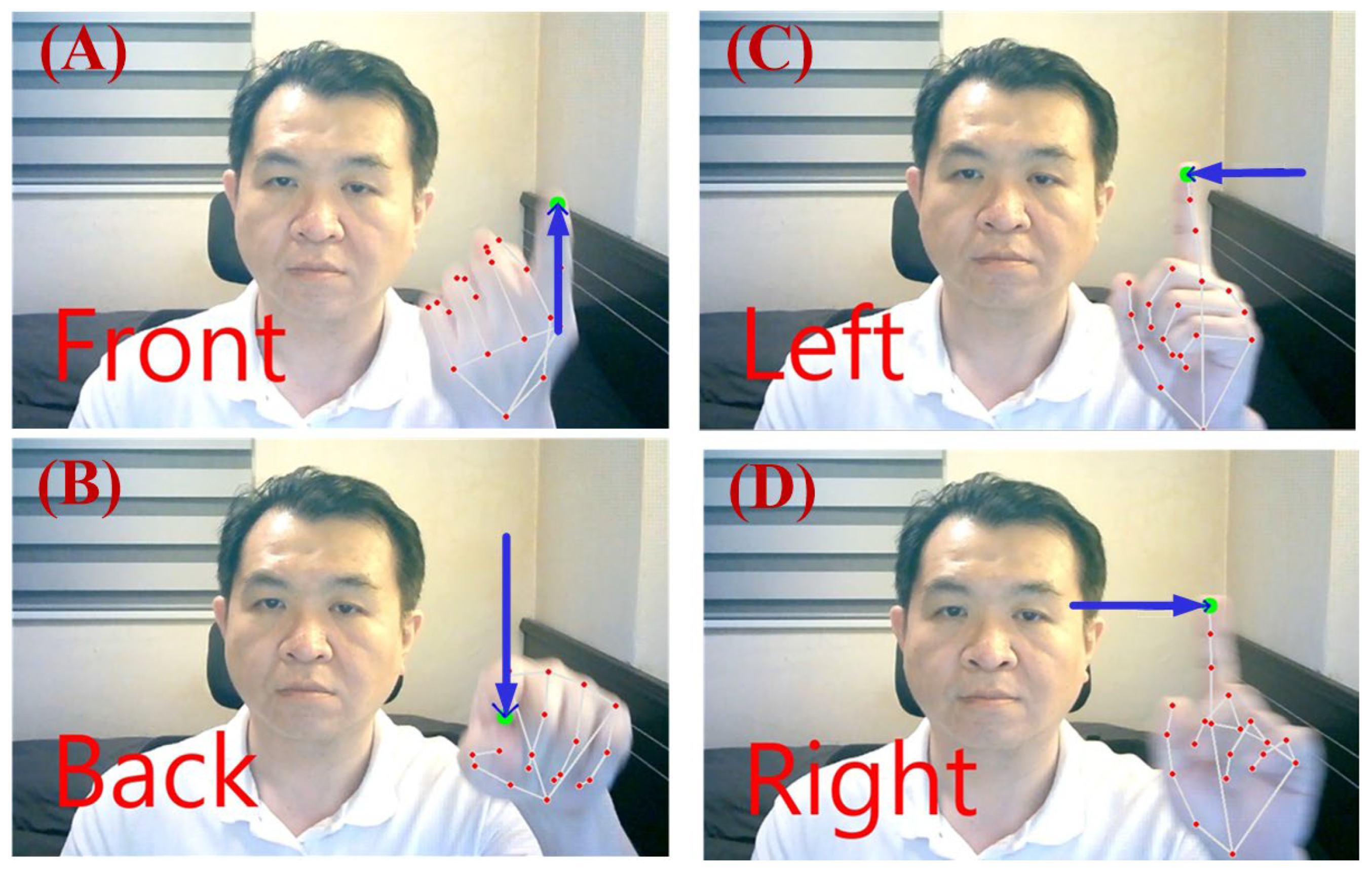 In this study, the hand detection solution provided by the MediaPipe framework was utilized. Images were captured by the system’s camera and processed using the open-source hand detection module of MediaPipe. This module applies machine learning techniques to detect hand regions and accurately estimate the 21 hand-joint landmark coordinates from a single image frame. The extracted landmark positions were subsequently used for hand gesture and posture recognition. In the proposed system, the index fingertip position serves as the reference point for determining four directional commands, which are forward, backward, left, and right, to achieve fine motion control of the XY platform. MediaPipe identifies 21 key points on the hand, where landmark point 8 corresponds to the index fingertip, as illustrated in