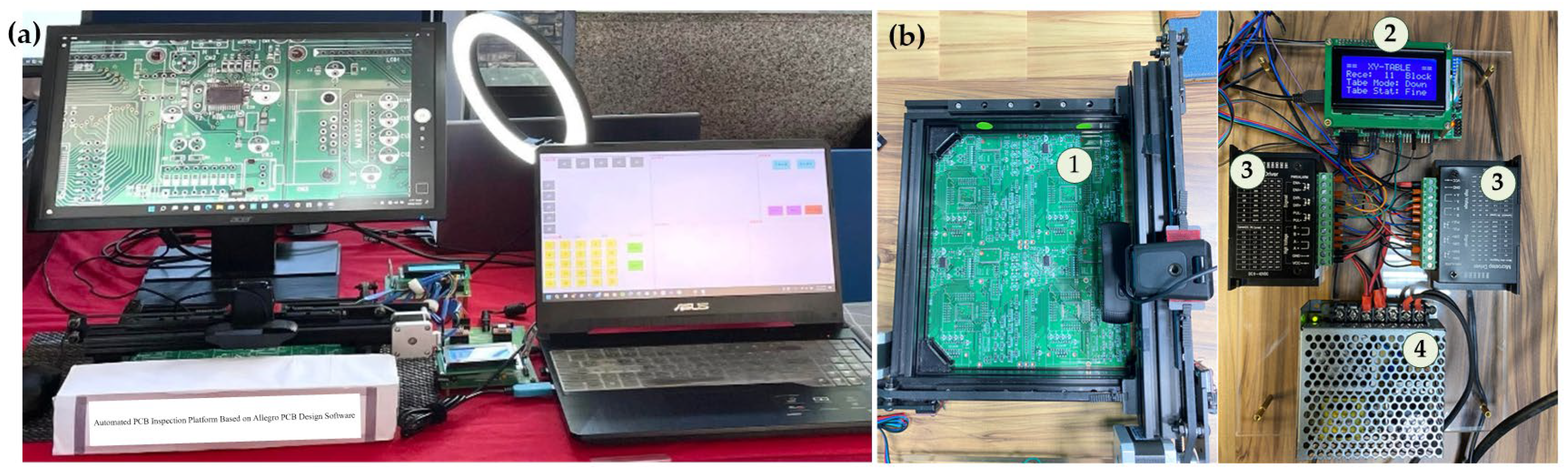 Figure 20a illustrates the hardware configuration of the proposed optical inspection system. The Raspberry Pi transmits the extracted positioning coordinates wirelessly via Bluetooth to the ATmega168 microcontroller. Upon receiving the coordinates, the ATmega168 immediately drives the stepper motors along the X- and Y-axes, moving the dual-axis linear stage to the designated region and thereby completing the coarse positioning of the XY platform.