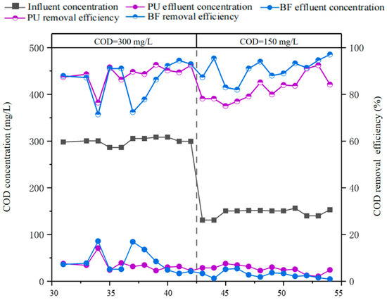 When the influent COD was 300 mg/L (Day 31–42), the COD removal rates of the BF and PU reactors fluctuated between 71.4–94.5% and 76.4–92.5%, respectively (Figure 4). After the influent COD concentration in the intermittent operation was reduced to 150 mg/L (Day 43–55), the COD removal efficiency of the BF reactor (averaging 90.5%) was significantly superior to that of the PU reactor (averaging 82.3%).