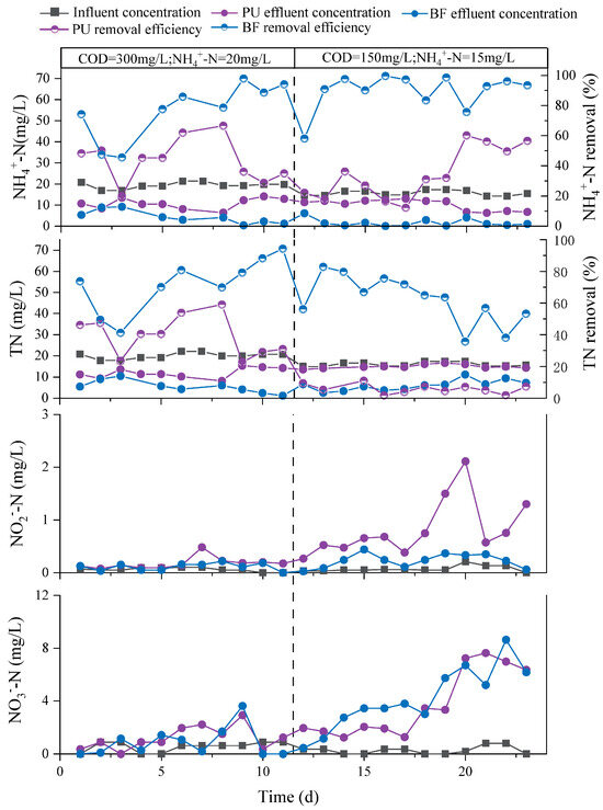 Both the BF and PU reactors achieved their optimal nitrogen removal performance at an HRT of 4 h. During this phase, with a stable influent NH4+-N concentration around 20 mg/L, the average NH4+-N removal efficiencies for the BF and PU reactors were both higher than 90% (Figure 3). In the effluents of both the BF and PU reactors, slight accumulations of NO2−-N and NO3−-N nitrogen were observed. This indicates that after NH4+-N was oxidized to NO2−-N, complete denitrification for NO3−-N removal was not achieved.