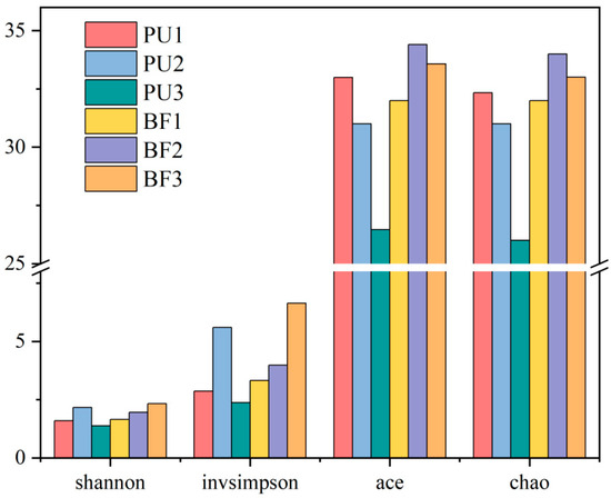 Alpha diversity index of biofilms on different biocarriers. BF1, BF2, BF3, PU1, PU2, and PU3 represent the biofilm samples collected from the BF and PU reactors during the startup phase, continuous-flow phase, and intermittent-flow phase, respectively.