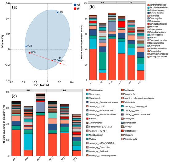 At the order level, Xanthomonadales, Saccharimonadales, Chitinophagales, Burkholderiales, and Frankiales were identified as the dominant orders, with their relative abundances varying considerably among different samples. When the operational mode shifted from continuous-flow to intermittent-flow, the relative abundance of Xanthomonadales on the PU carrier increased from 9.6% to 54.0%, while it decreased from 32.8% to 12.8% on the BF carrier (Figure 7b). Bacteria within the order Xanthomonadales are predominantly aerobic heterotrophs known for their capacity to degrade complex organic compounds and reduce COD [23]. In contrast, the relative abundance of Saccharimonadales on the PU carrier declined from 4.2% to 0.6%, whereas it remained relatively stable on the BF carrier. Furthermore, the relative abundance of Burkholderiales decreased on the PU carrier but increased on the BF carrier. Bacteria belonging to the orders Saccharimonadales and Burkholderiales are primarily facultative anaerobes, many of which possess denitrification capabilities [24,25].