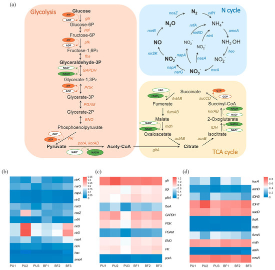 Glycolysis and the TCA cycle are key pathways for energy generation in C metabolism [22]. Glucose is degraded to pyruvate via glycolysis, then converted to acetyl-CoA, which subsequently enters the TCA cycle and is ultimately oxidized to CO2 through respiration. The electron donors required for denitrification are derived from NADH generated during glycolysis and the TCA cycle [22]. Consequently, the functional genes involved in C metabolism are closely linked with those involved in N metabolism.