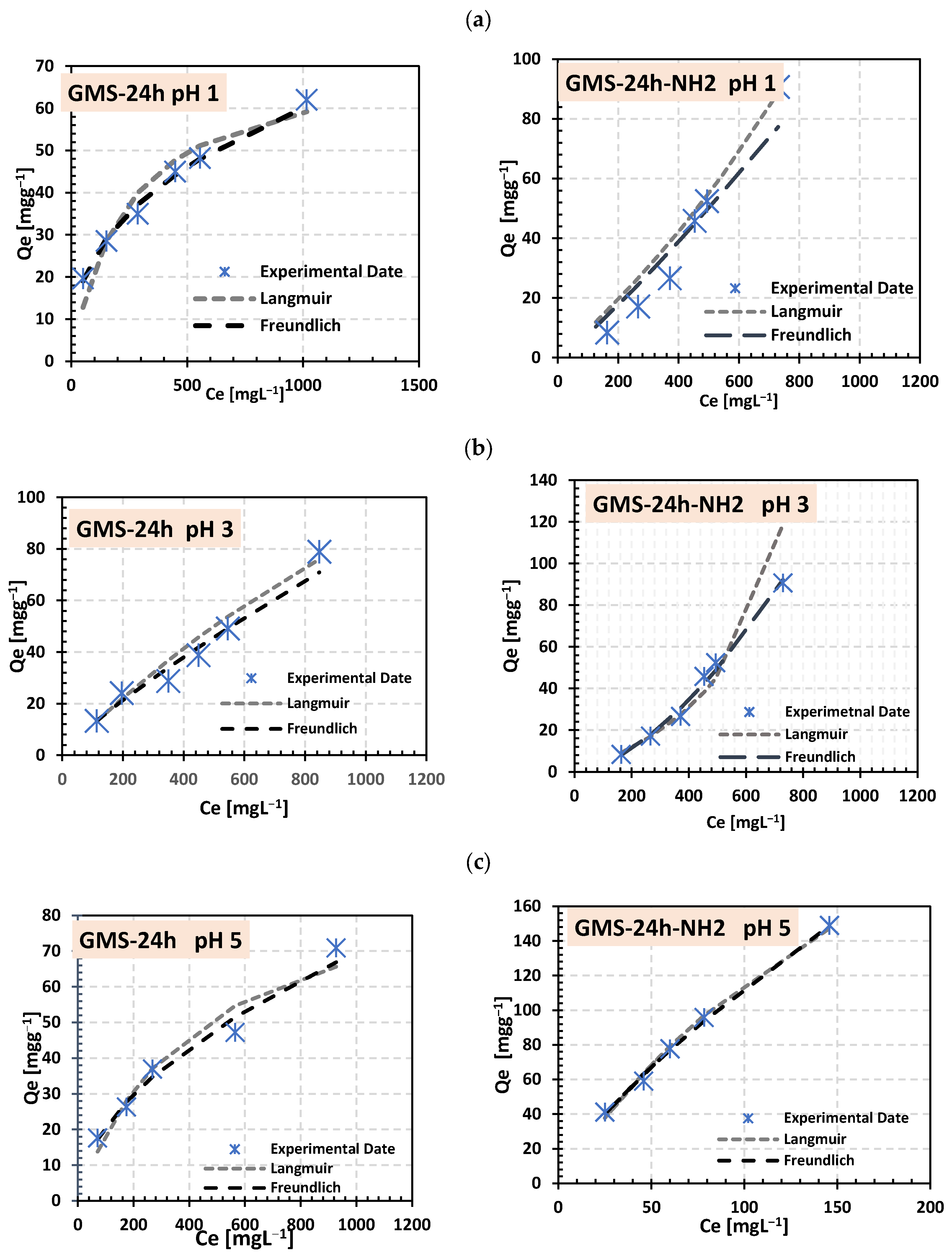 - The GMS-24 h material exhibited a high chromium removal capacity at pH 3, with a maximum adsorption of 303 mg·g−1. In contrast, the amine-functionalized GMS-24 h–NH2 showed its highest adsorption capacity at pH 5, reaching 370 mg·g−1.