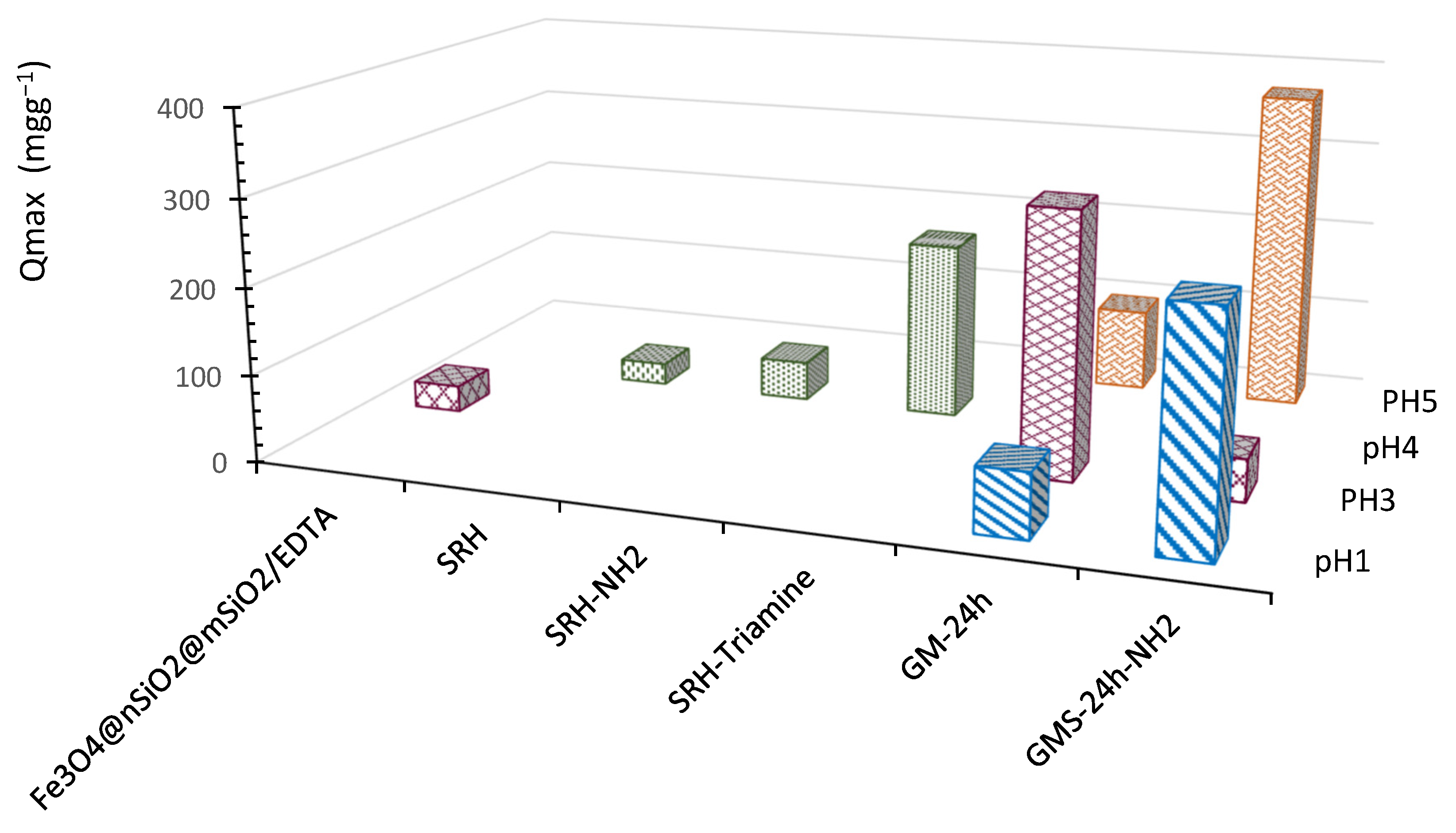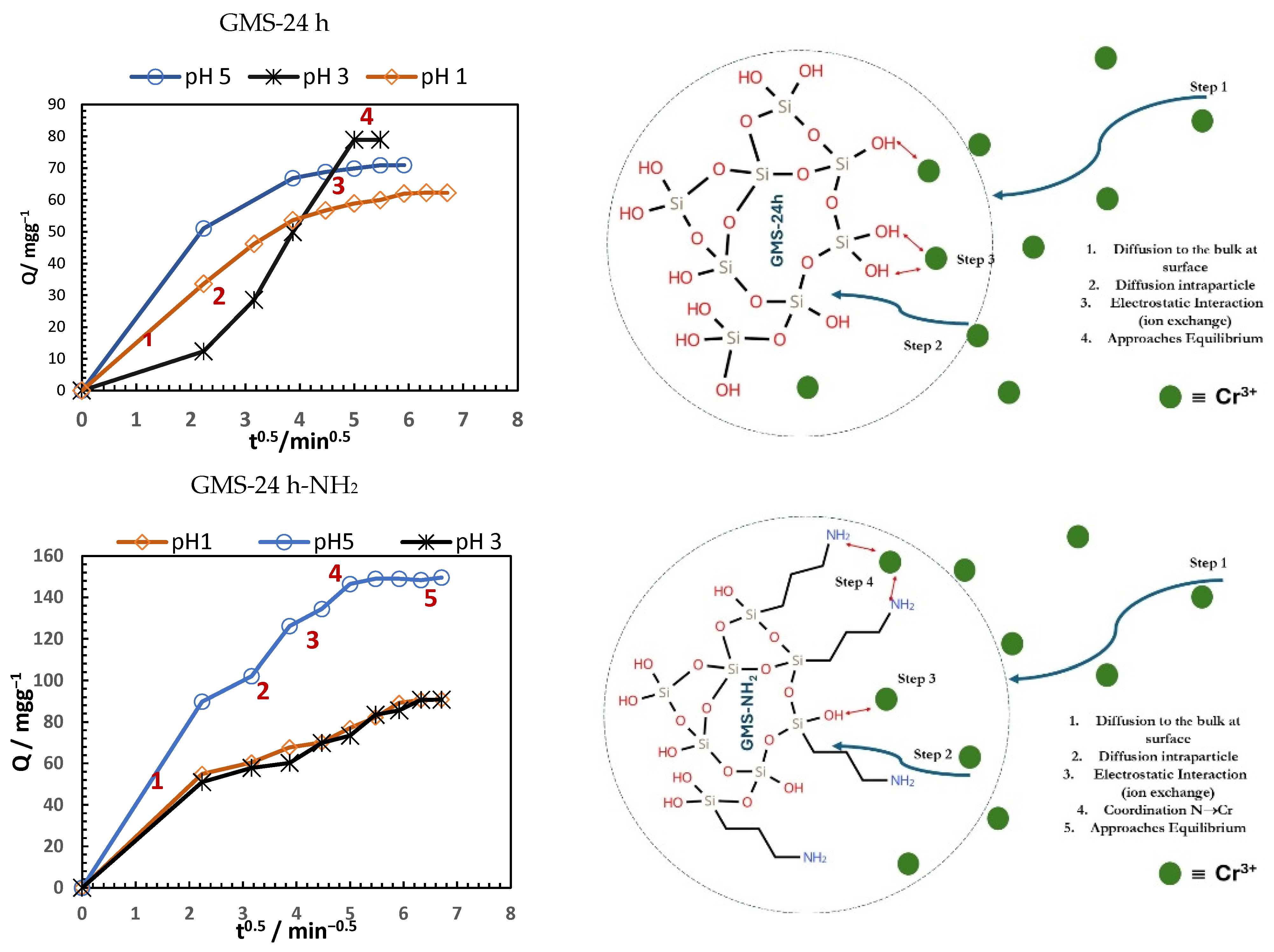 - No significant changes in the adsorption mechanism were observed with respect to pH. For GMS-24 h, the highest adsorption at pH 3 is associated with ion exchange or electrostatic interaction as the dominant step. At pH 1 and 5, analyte diffusion toward the surface was the predominant mechanism.