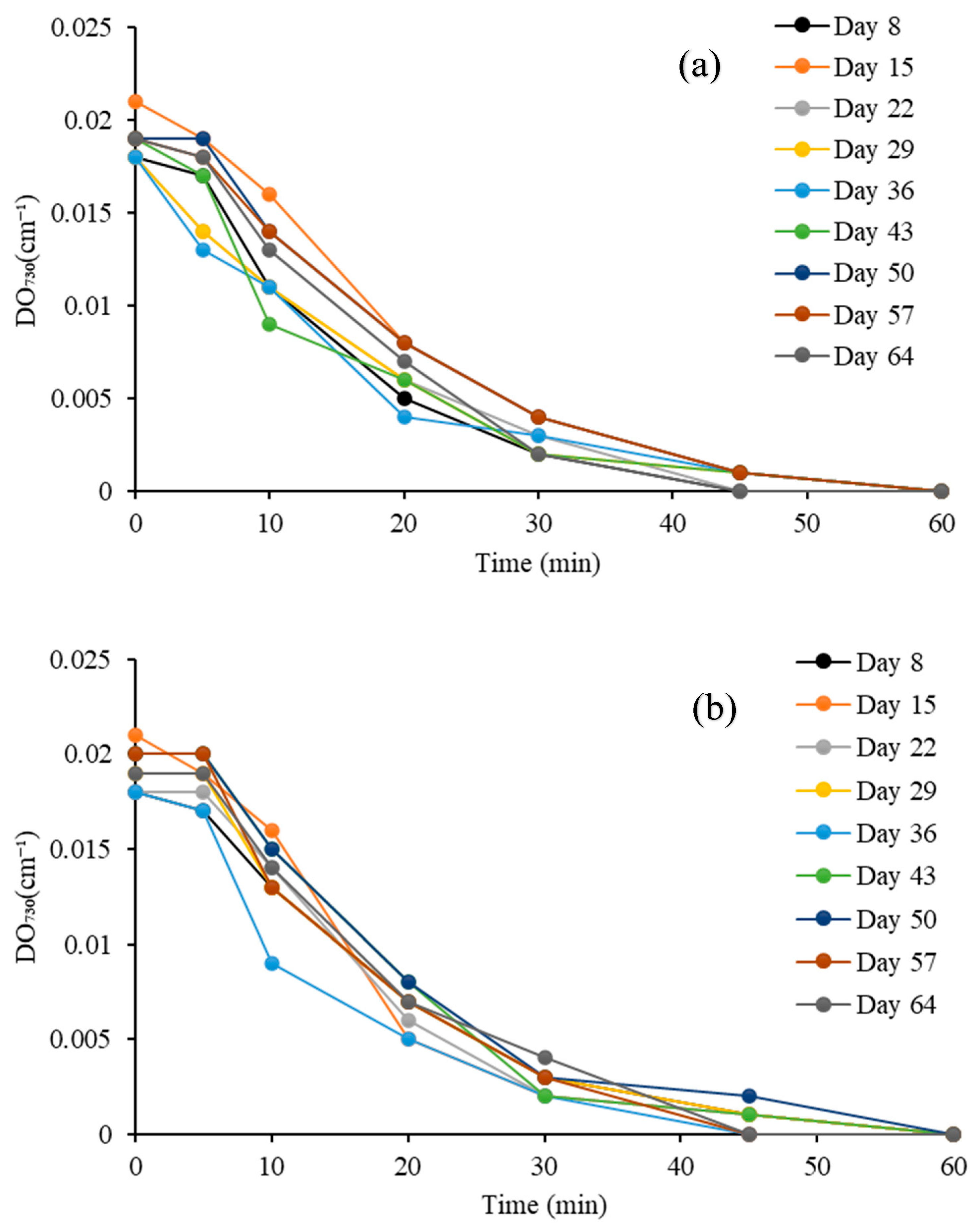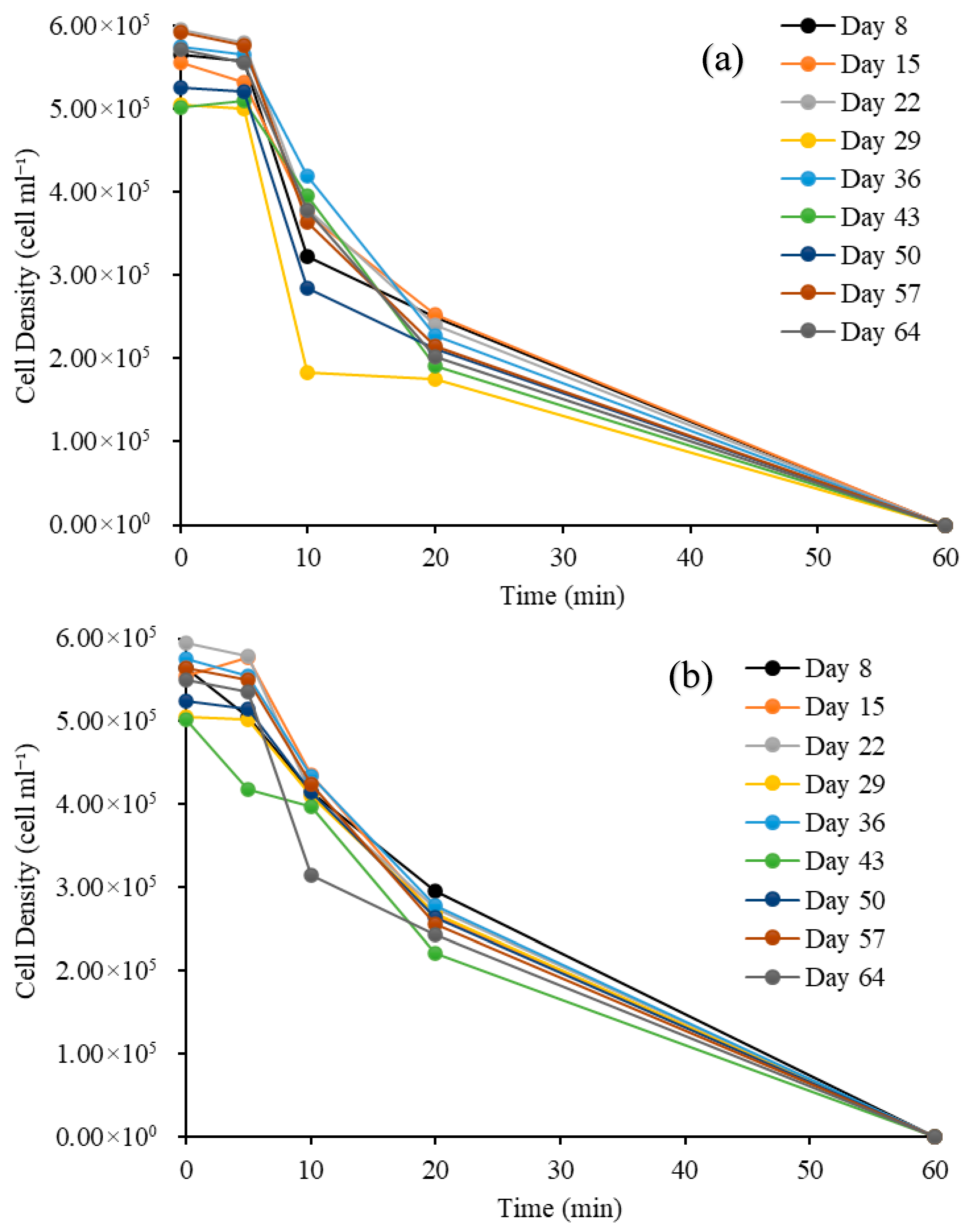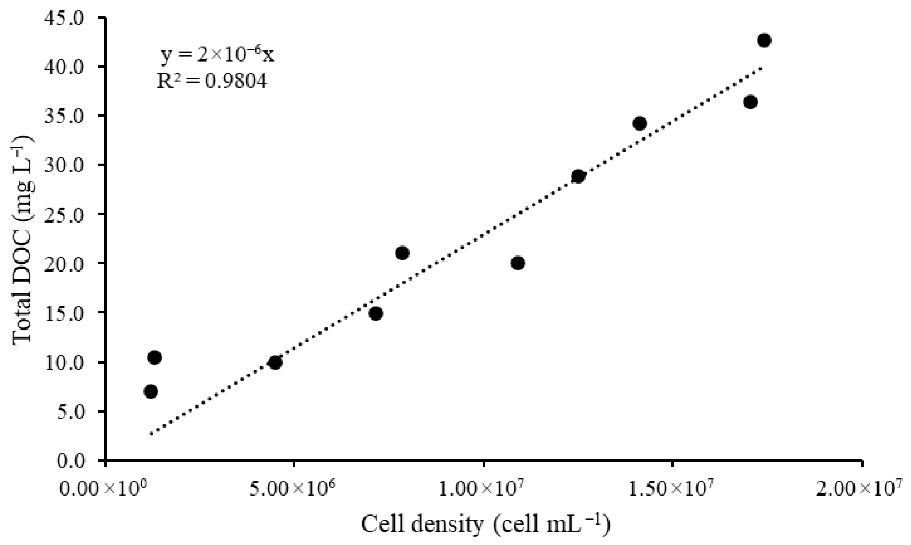 | Growth Time (Days) | Total DOC (mg L−1) | Cell Density (Cell mL−1) | The DOC/Cell Ratio |