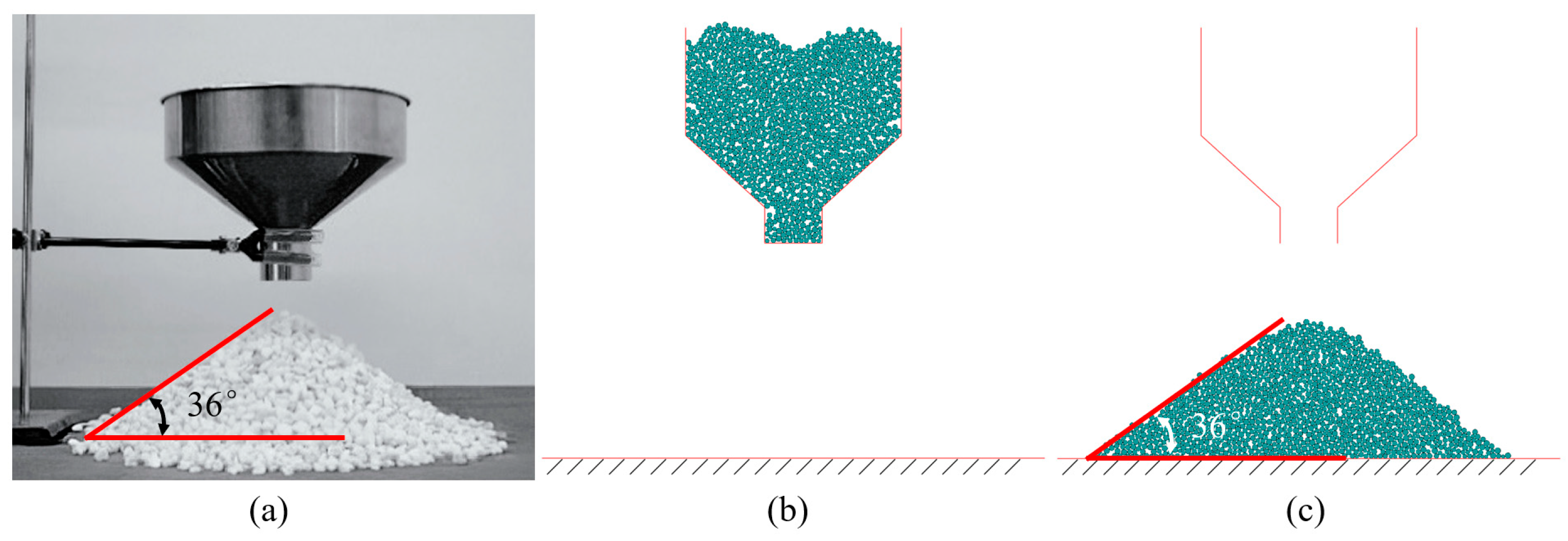 Figure 1. Calibration of parameters for the natural angle of repose using the fixed-funnel method: (a) physical experiment; (b) initial stage of numerical simulation; (c) final stage of numerical simulation.