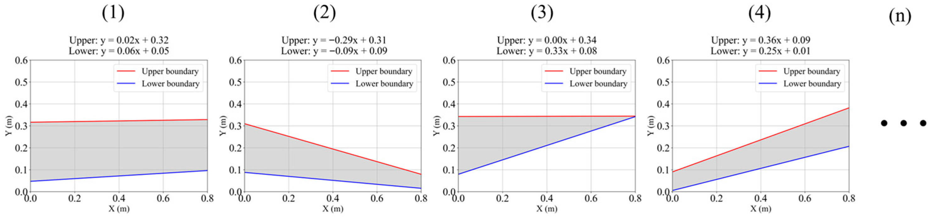 In both the pre-defined and post-defined models, a Cartesian X–Y coordinate system is established on the two-dimensional plane, with the boundary lines represented as two continuous lines within this coordinate system. For the pre-defined model, the upper and lower boundaries correspond to the topmost and bottommost particles of the interburden particle collection. For the post-defined model, two boundary lines are randomly generated within the range x, y ∈ (0, 0.8 m), with the upper boundary always positioned above the lower boundary, thereby representing the region of the specific particle collection. The morphology of randomly generated upper and lower boundaries is illustrated in Figure 5.