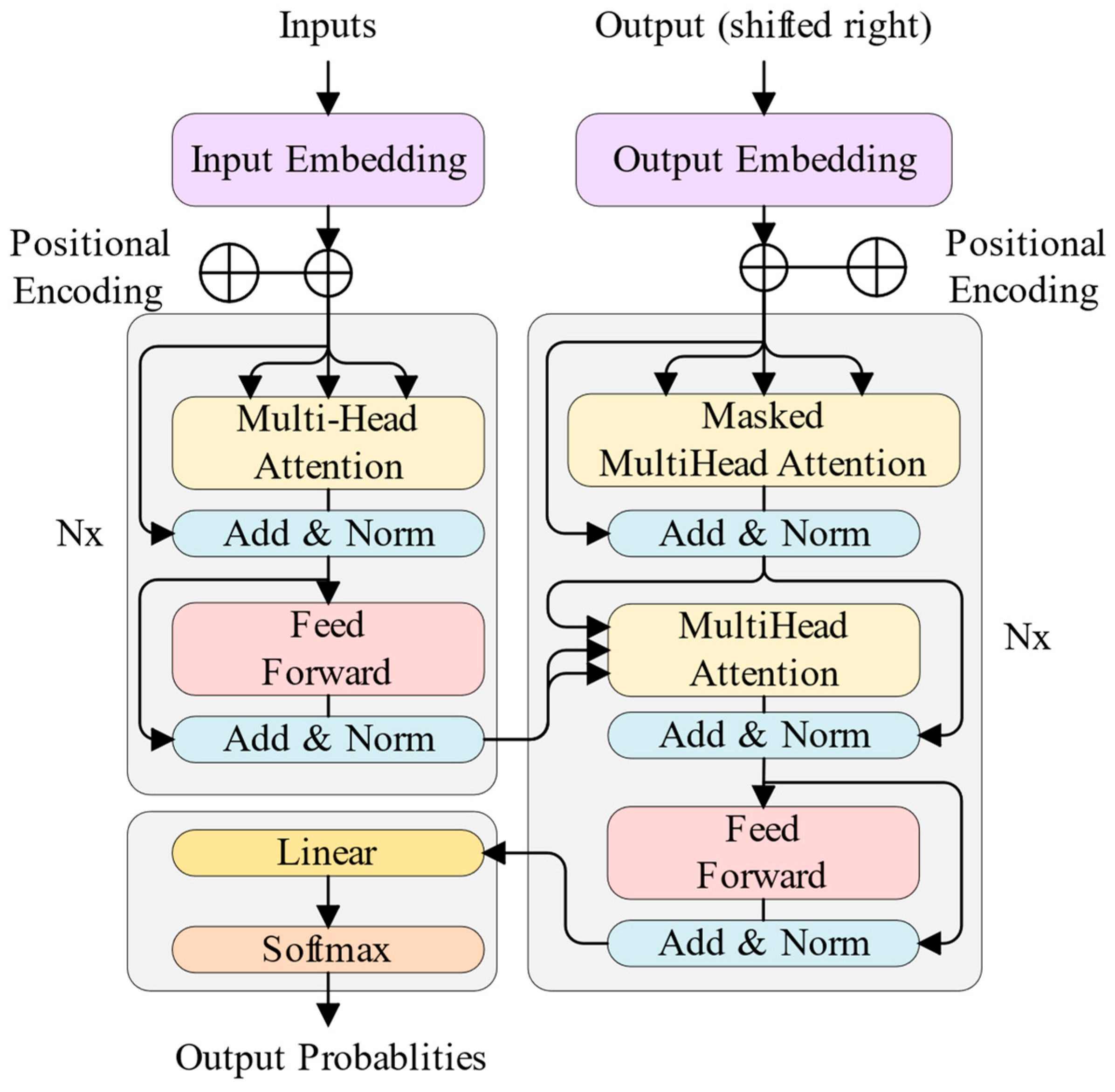 The fundamental architecture of the Transformer is illustrated in Figure 7. It consists of an encoder and a decoder, both constructed by stacking N identical layers [26]. The encoder is composed of two sublayers: (1) Multi-Head Self-Attention, which captures global dependencies among elements in the input sequence; and (2) the Position-wise Feed-Forward Network (FFN), which performs nonlinear transformations on features at each sequence position. Each sublayer adopts the standard structure of layer normalization → sublayer computation → residual connection, a design that substantially improves training stability and alleviates the vanishing gradient problem.