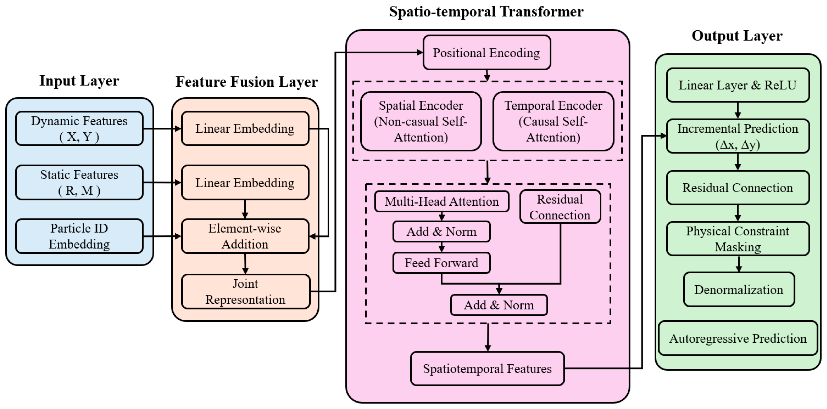 Within the backbone, the model adopts a Spatio-temporal Transformer structure composed of a Spatial Encoder (non-causal self-attention) and a Temporal Encoder (causal self-attention). The Spatial Encoder models instantaneous interactions among particles within a single time step, consistent with the principle of spatial simultaneity in particle motion. In contrast, the Temporal Encoder performs sequential modeling of trajectory evolution under the constraint of a causal mask M causal , ensuring that trajectory prediction strictly adheres to temporal causality and preventing information leakage from future states. The self-attention computation of the Temporal Encoder is defined as follows: