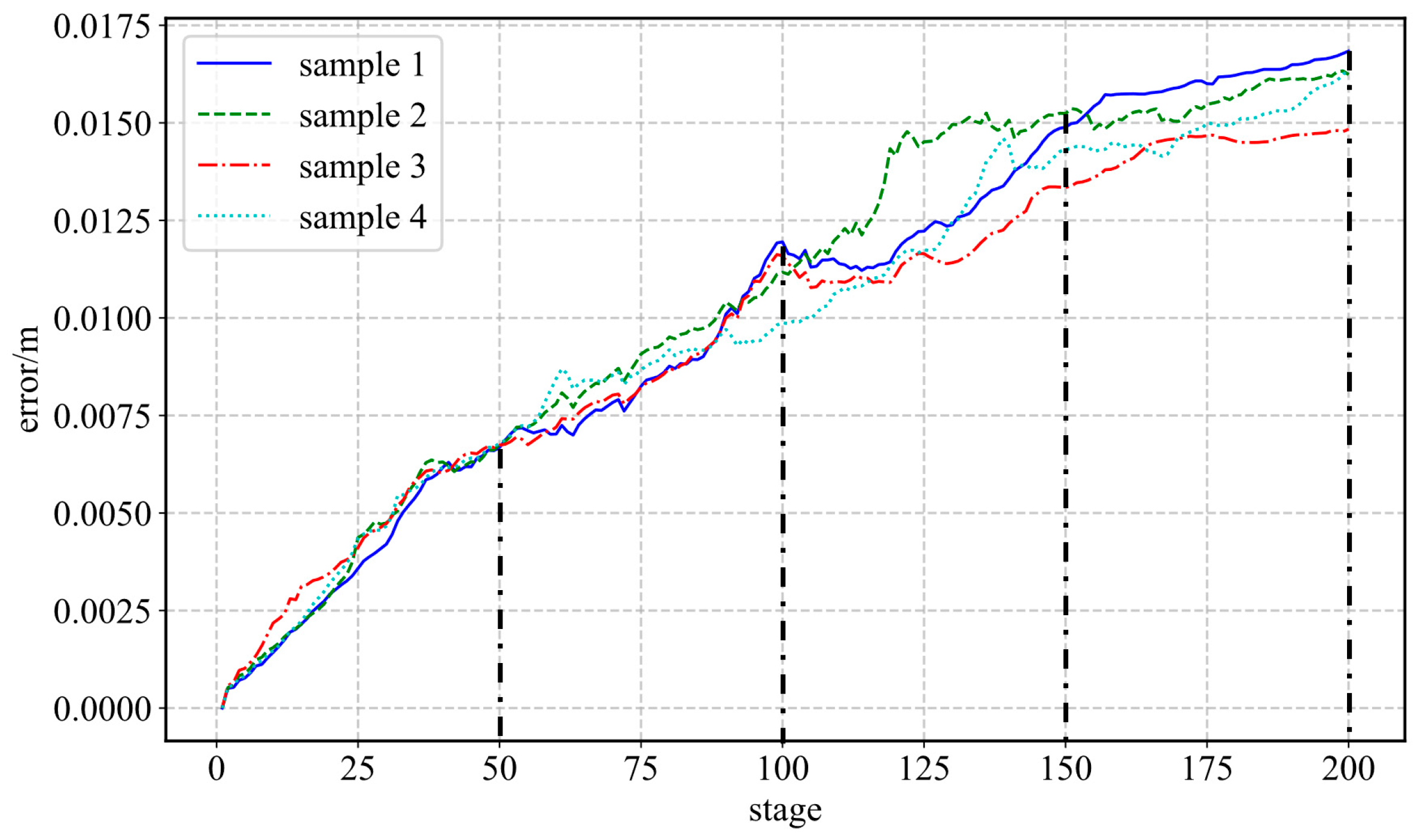 Figure 10. Prediction error curves of particle positions during the ore-drawing process for four validation samples.
