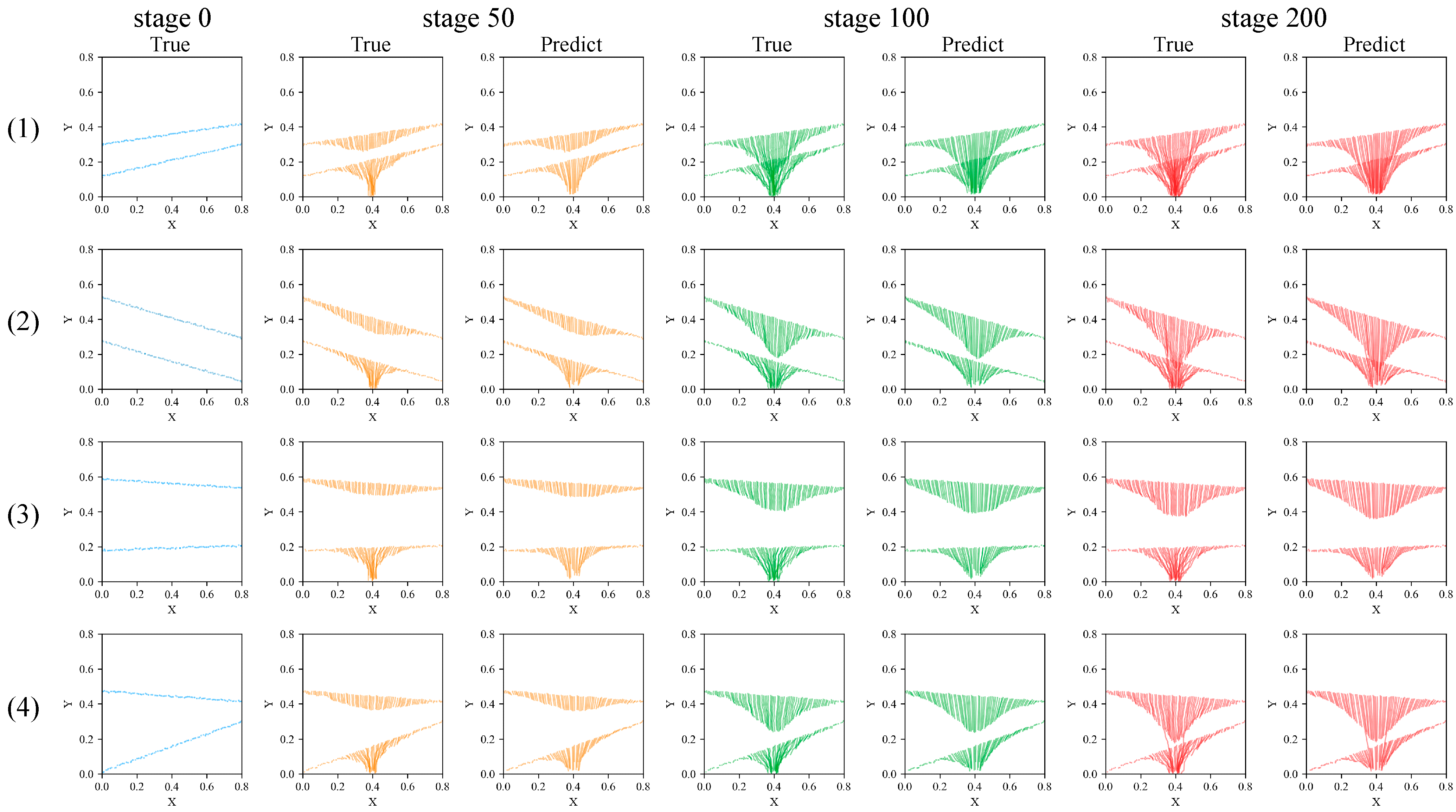 Figure 12. Comparison of true and predicted trajectories of interburden boundary particles during the ore-drawing process (four samples at stages 0, 50, 100, and 200).