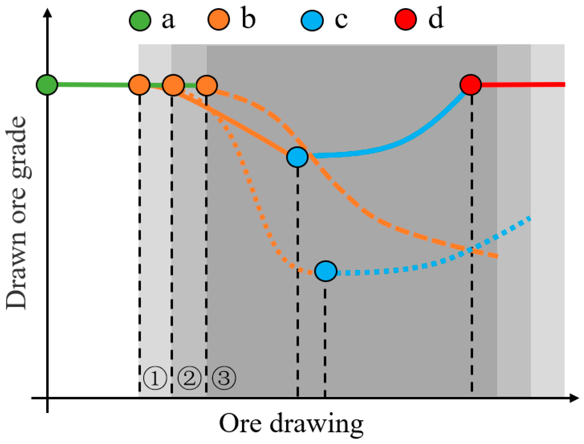 Figure 13. The key nodes of drawn ore grade during the ore-drawing process.