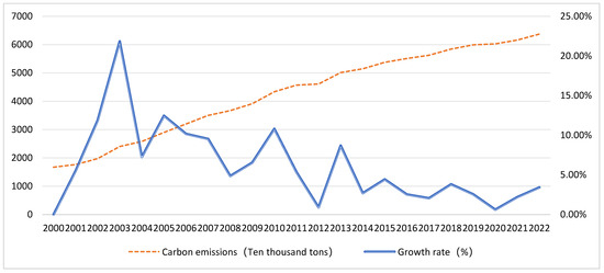 Carbon Emissions and Growth Rate of Energy Consumption in Jiangxi Province from 2000 to 2022. Note: The left vertical axis represents carbon emissions (in 10,000 tons), and the right vertical axis shows the annual growth rate (in percentage). Data source: Jiangxi Statistical Yearbook and China Energy Statistical Yearbook.