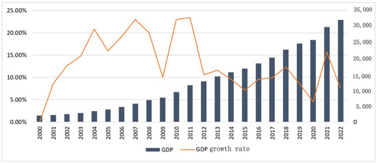 Jiangxi Province GDP and Growth Rate from 2000 to 2022. Note: The left vertical axis represents GDP (in billion yuan), and the right vertical axis shows the annual growth rate (in percentage). Data source: Jiangxi Statistical Yearbook.