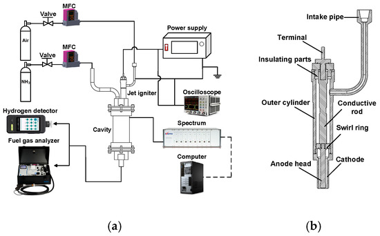 (a) Experimental setup; (b) plasma-assisted ammonia jet flame ignitor.
