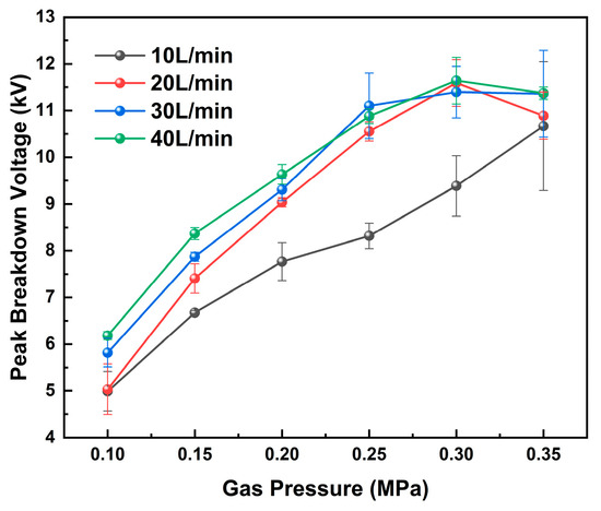 To evaluate the influence of pressure on the breakdown characteristics, the peak breakdown voltage was measured under different pressure conditions, as shown in Figure 3. It is evident that the breakdown voltage increases monotonically with increasing pressure. At an air flow rate of 10 L/min, the peak breakdown voltage increases from 4.99 kV to 10.67 kV as pressure increases.