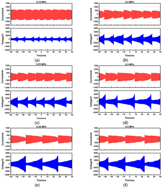 To systematically evaluate the arc-sustaining process of the plasma-assisted ammonia jet flame ignitor, voltage–current characteristics were measured at a fixed power supply setting of 180 W and 20 kHz, with chamber pressure varying from 0.1 to 0.4 MPa. Waveforms were recorded over a 100 ms duration using a digital oscilloscope, as summarized in Figure 4.