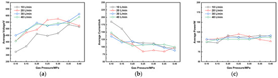The effect of pressure on the arc-sustaining process: (a) average discharge voltage; (b) average discharge current; (c) average discharge power of the plasma jet igniter.