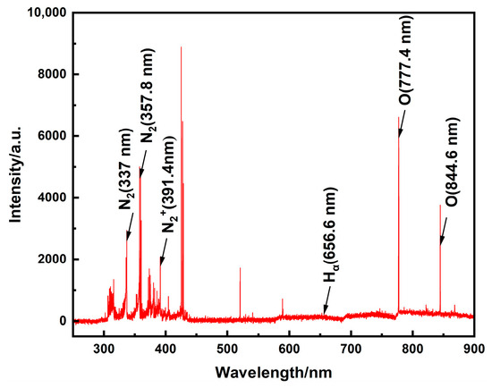 A typical emission spectrum of the gliding arc discharge under atmospheric pressure is presented in Figure 6. When operating with air as the working gas (without ammonia ignition), the plasma-assisted ammonia jet flame ignitor emission is primarily distributed between 300 nm and 850 nm. The spectral lines within the 350–450 nm range exhibit higher intensity. Characteristic lines from nitrogen species and oxygen atoms are identified, including the Second Positive System N2 (C2Πu → B2Πg) bands at 337.1 nm and 357.8 nm, and the First Negative System of N2+ (B2Σu+ → X2Σg+) at 391.4 nm, and atomic oxygen lines at 777.4 nm and 844.6 nm. As oxygen atoms act as crucial catalysts in combustion, their spectral presence serves as a key indicator for assessing the efficacy of the plasma-assisted ammonia jet flame ignitor. These results demonstrate that plasma-assisted ignition provides a substantial quantity of excited molecules, particles, and free radicals. These highly reactive species facilitate subsequent combustion chemical reactions, thereby enhancing the overall ignition and combustion performance.