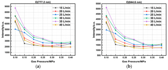 Variation in the emission intensity of the O characteristic line at different pressure conditions: (a) O characteristic line at 777.2 nm; (b) O characteristic line at 844.6 nm.
