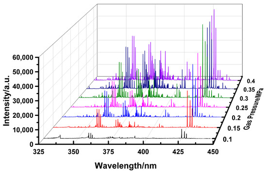 To assess the practical implications for ignition, spectra were captured during ammonia combustion at φ = 0.6 under various pressures, as shown in Figure 9. Similar to the spectral evolution observed in air discharge, the emission intensities of the oxygen atomic lines at 777.4 nm and 844.6 nm decreased significantly with increasing chamber pressure, while the nitrogen-dominated emission in the 350–450 nm range is simultaneously enhanced. This consistent trend underscores the general influence of pressure on the plasma’s radiative properties, regardless of the presence of ammonia.