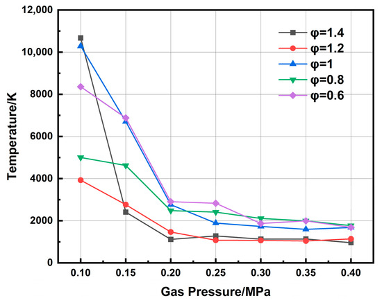 Because the working medium in this study was air, the discharge spectrum was rich in nitrogen molecular bands. Consequently, the widely used dual-line method was adopted, utilizing two prominent N2 lines at 337.1 nm and 357.7 nm. The necessary atomic parameters for these lines are summarized in Table 1. It should be clarified that the excitation temperature obtained in this work is a spectroscopic temperature, which characterizes the population distribution of excited atomic states rather than the actual physical temperature of the jet igniter or the bulk gas. The excitation temperature is commonly used as an effective indicator of energy exchange between electrons and heavy particles in non-equilibrium plasmas. The physical temperature of the igniter during operation is generally much lower than the excitation temperature. Therefore, the excitation temperature reported here should be interpreted as a local plasma parameter, rather than the macroscopic thermal temperature of the igniter. Figure 11 displays the calculated electron excitation temperature for different chamber pressures, revealing a pronounced negative correlation. A representative case at an equivalence ratio of 1 shows a decrease from 10,290 K to 1682 K as pressure rises from 0.1 MPa to 0.4 MPa. This significant reduction is attributed to a synergistic effect under elevated pressure. The increased gas density shortens the electron mean free path, limiting the energy electrons can gain from the electric field. Simultaneously, more frequent collisions with neutral species and ions promote rapid energy dissipation. Together, these mechanisms suppress the energy transfer efficiency from electrons to heavy particles, thereby lowering the overall plasma excitation temperature.