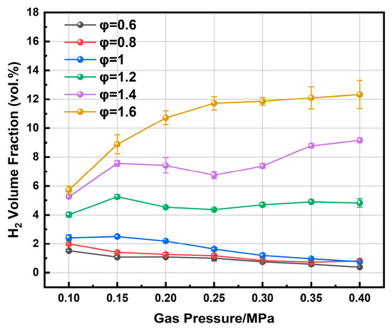 As summarized in Table 2, the hydrogen yield increases with rising pressure for φ > 1.2. For instance, at φ = 1.6, it rises from 5.73% at atmospheric pressure to 12.33% at 0.4 MPa. At φ = 1.2, the increase is more modest, from 4.02% to 4.82%. This trend can be attributed to enhanced ammonia decomposition under fuel-rich conditions, where the plasma energy is more efficiently diverted to break N-H bonds, resulting in higher H2 yields. Furthermore, the lean-fuel environment reduces competing reactions involving oxygen, such as the oxidation of ammonia, thereby promoting the cracking pathway. Conversely, the hydrogen content slightly decreases with increasing pressure, at φ ≤ 1. This trend may stem from the higher oxygen, which promotes the oxidation of ammonia over its decomposition, consuming NH3 that would otherwise produce H2.