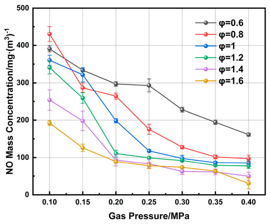 Figure 14 shows that NO concentration decreases markedly with rising pressure at equivalence ratios between 0.6 and 1.6. The concentration of NO in the exhaust gas is closely correlated with that of NH3. However, while NO consistently decreases with increasing pressure at different equivalence ratios, the NH3 concentration exhibits distinct pressure-dependent trends depending on the equivalence ratio.