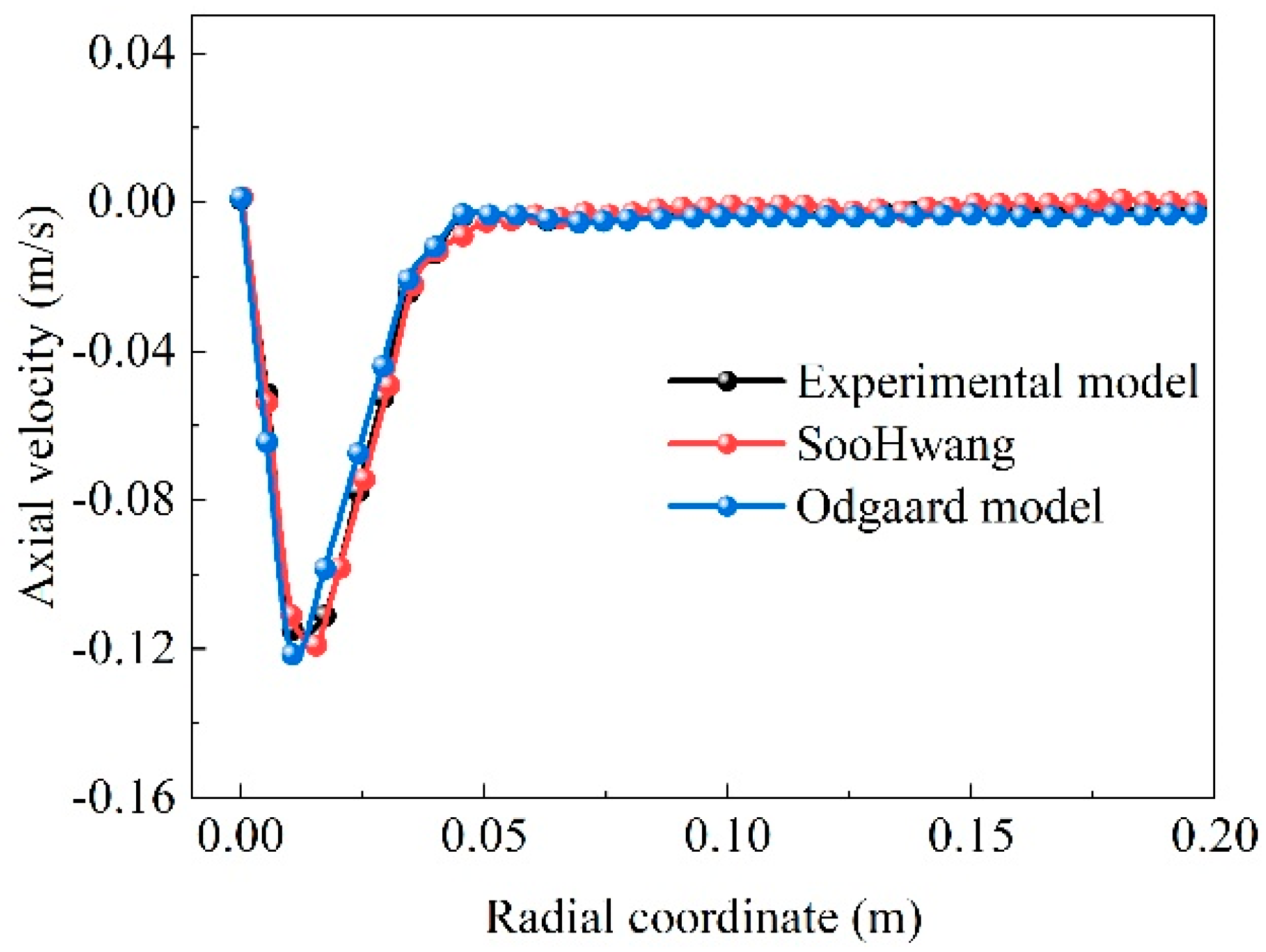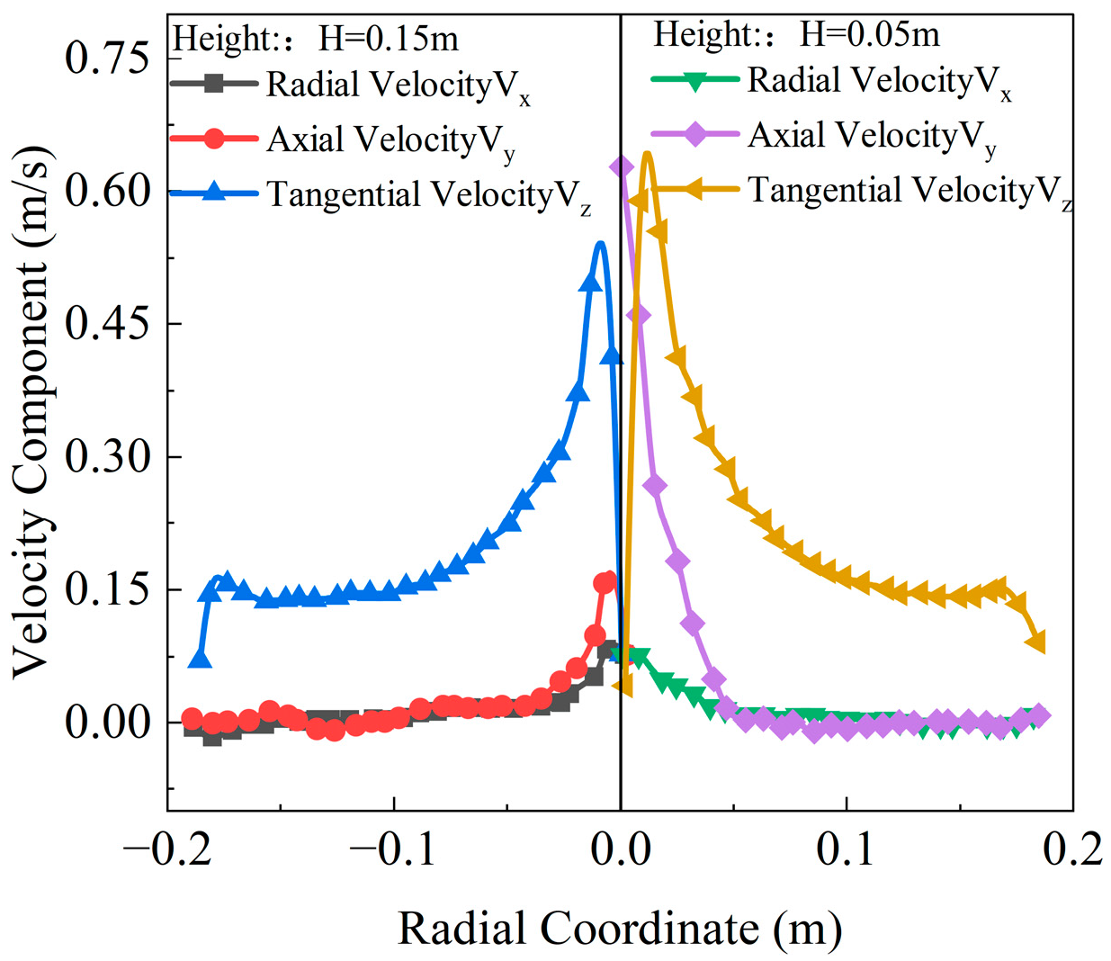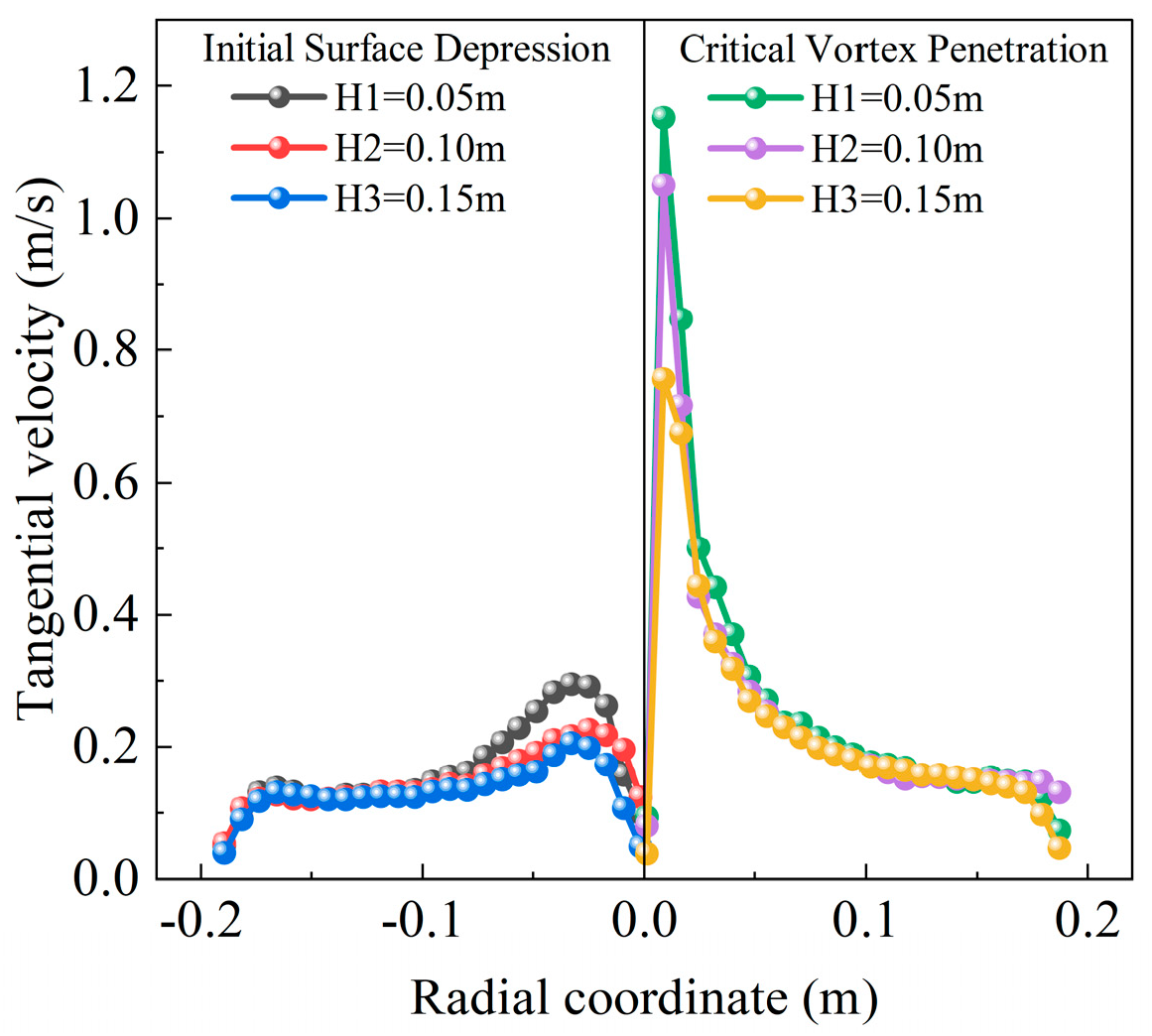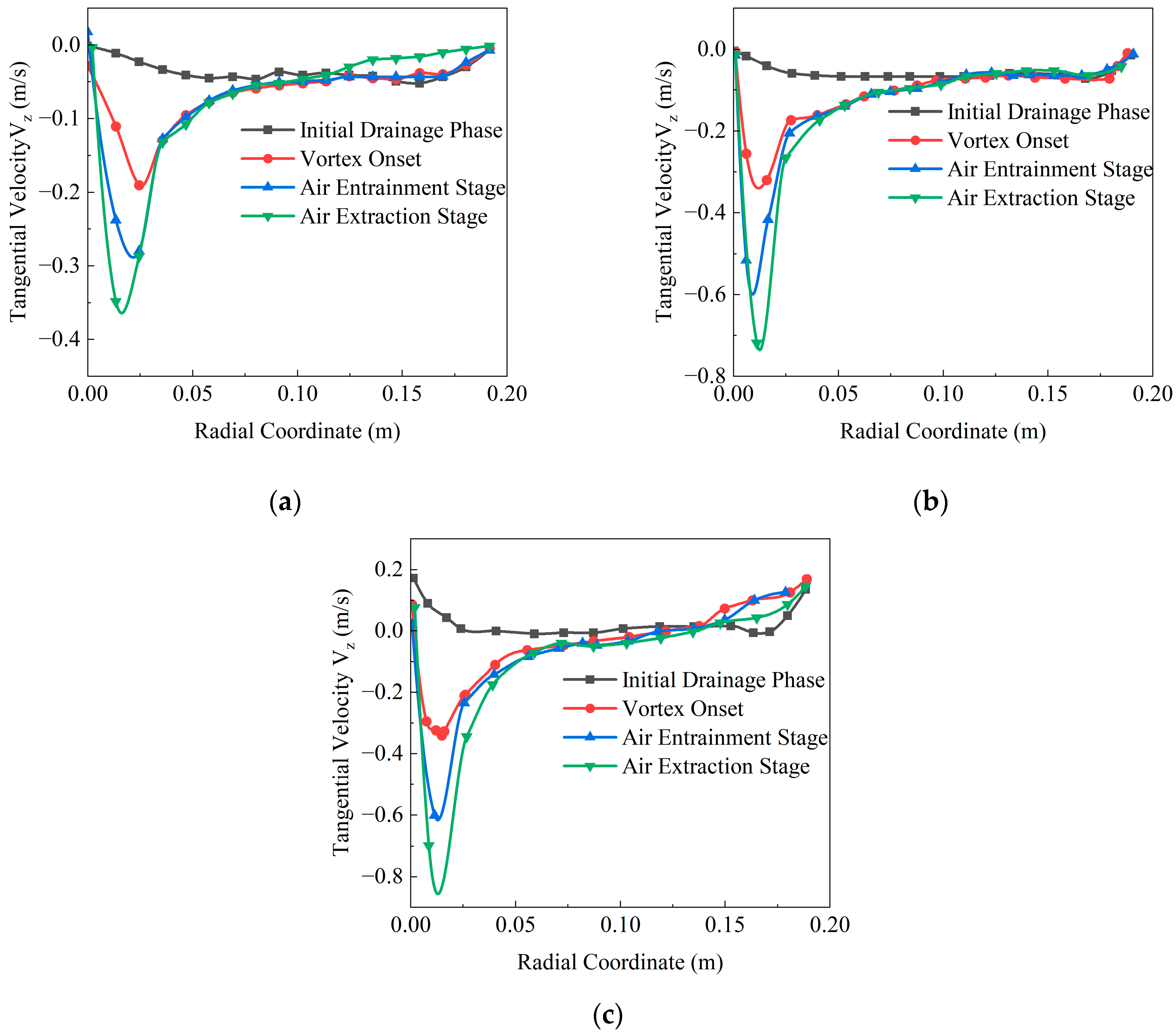 - Revealed vortex evolutionary dynamics and flow field structural characteristics. The vortex flow field strictly follows axisymmetric characteristics, with its tangential velocity distribution exhibiting the classical Rankine combined vortex structure. Vortex energy continuously concentrates toward the core during evolution, manifested as dynamic contraction of the vortex core radius and significantly higher peak tangential velocity during the critical penetration stage compared to the initial depression stage. This reflects the redistribution and concentration effect of angular momentum during vortex development.
