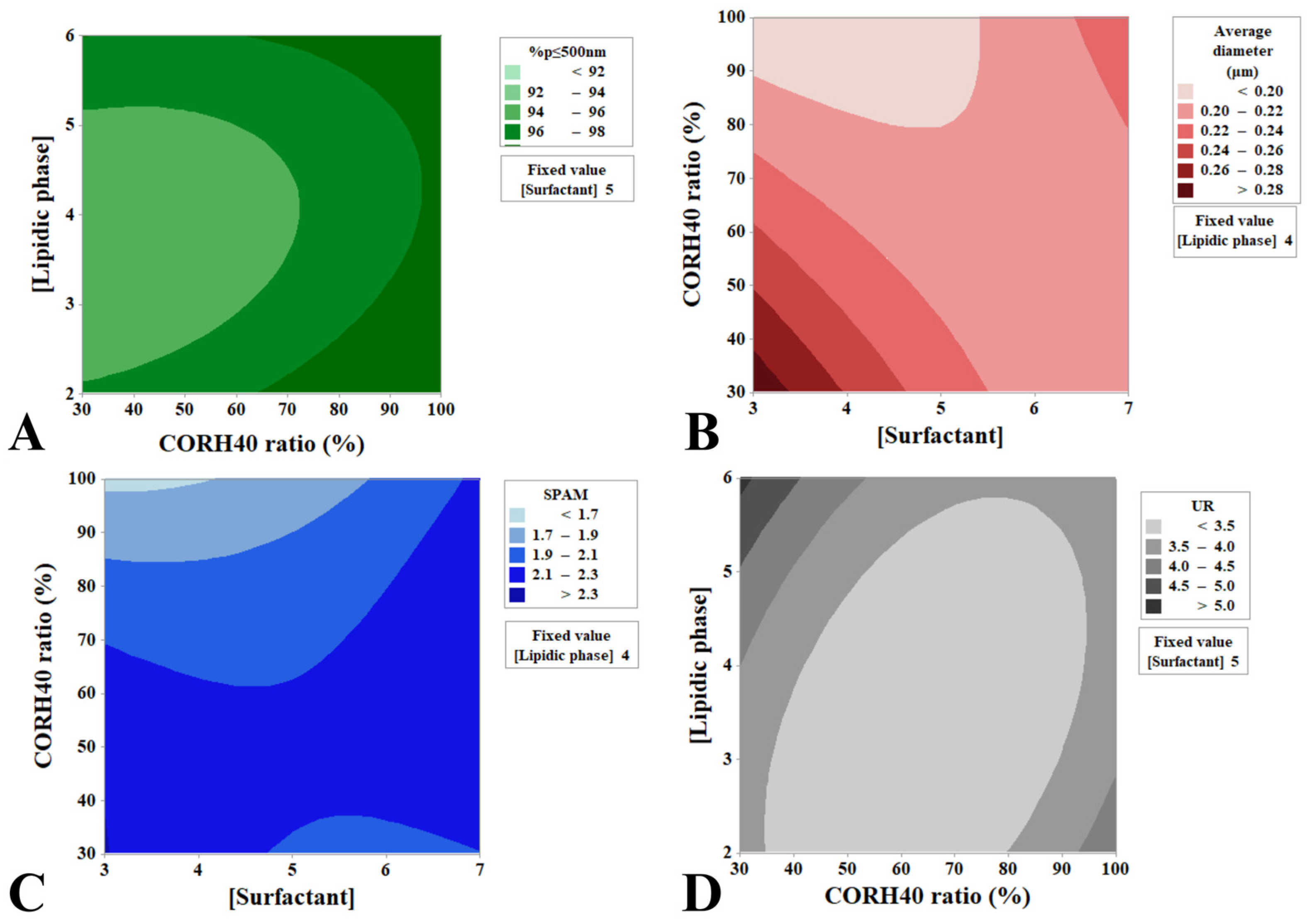 | Run Order | Formulation Code | [Surfactant] | CORH40 Ratio ** | [Lipid Phase] *** | %p ≤ 500 nm ± SD | Average Diameter (μm) ± SD | SPAM ± SD | UR ± SD |