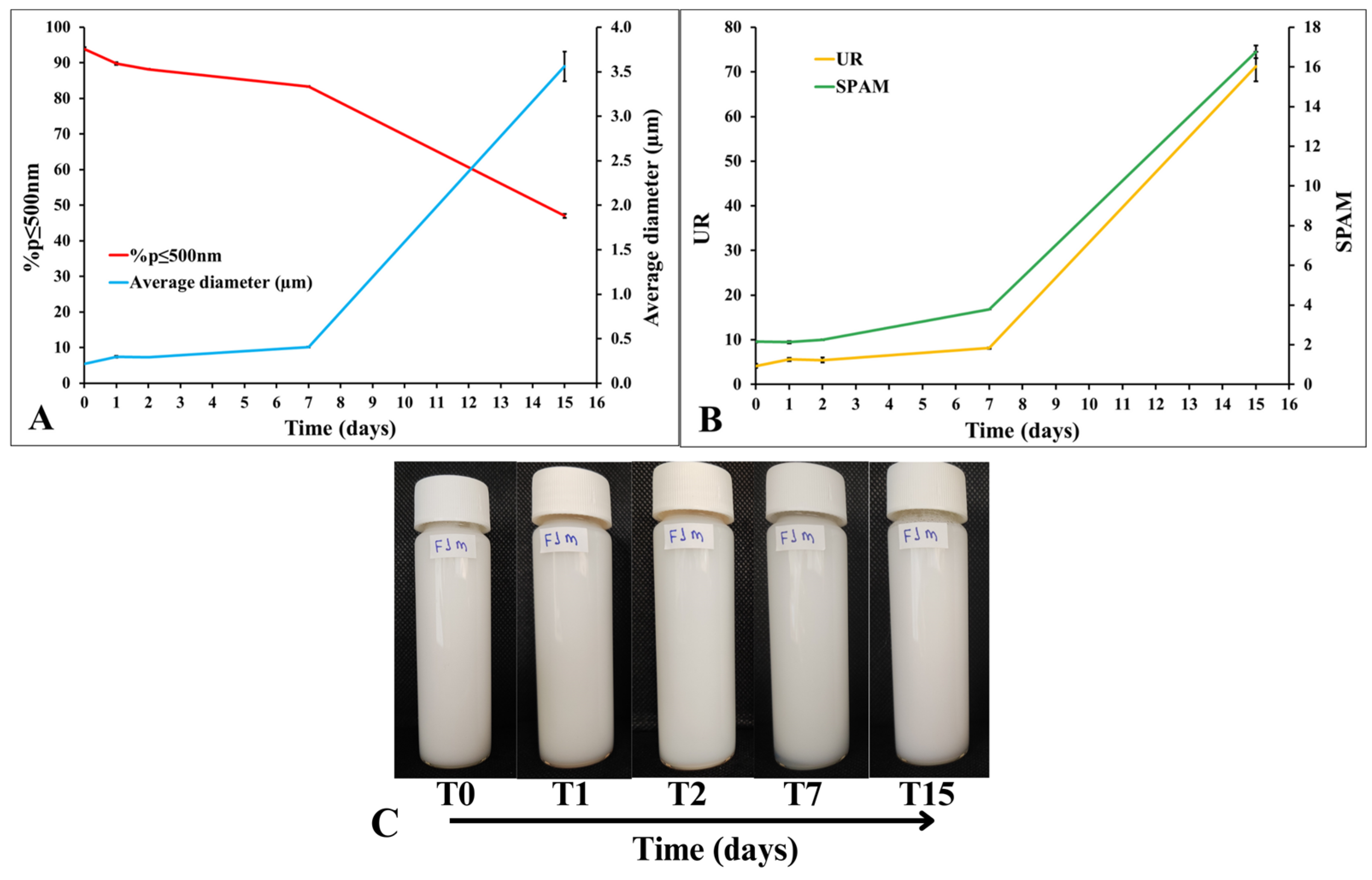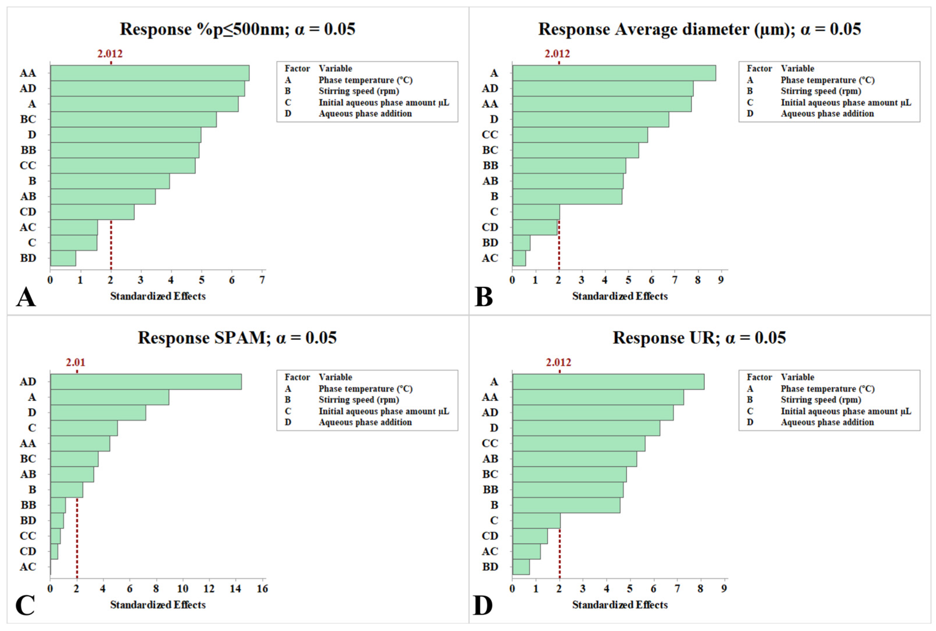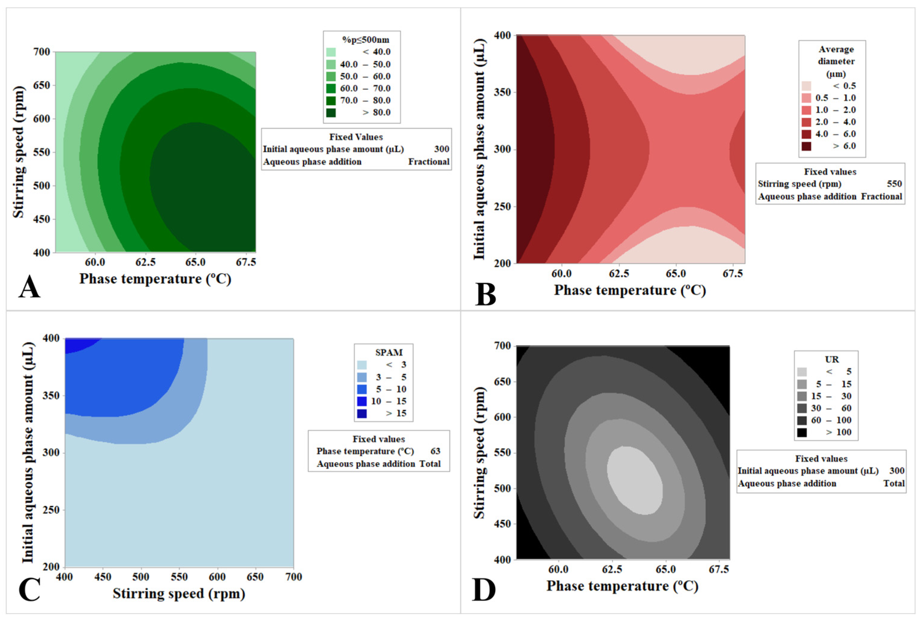 | Formulation (Run + Code) | Temperature (°C) | Stirring Speed (rpm) | Initial Aqueous Phase Amount (µL) | Aqueous Phase Addition | %p ≤ 500 nm | Average Diameter (μm) | SPAM | UR |