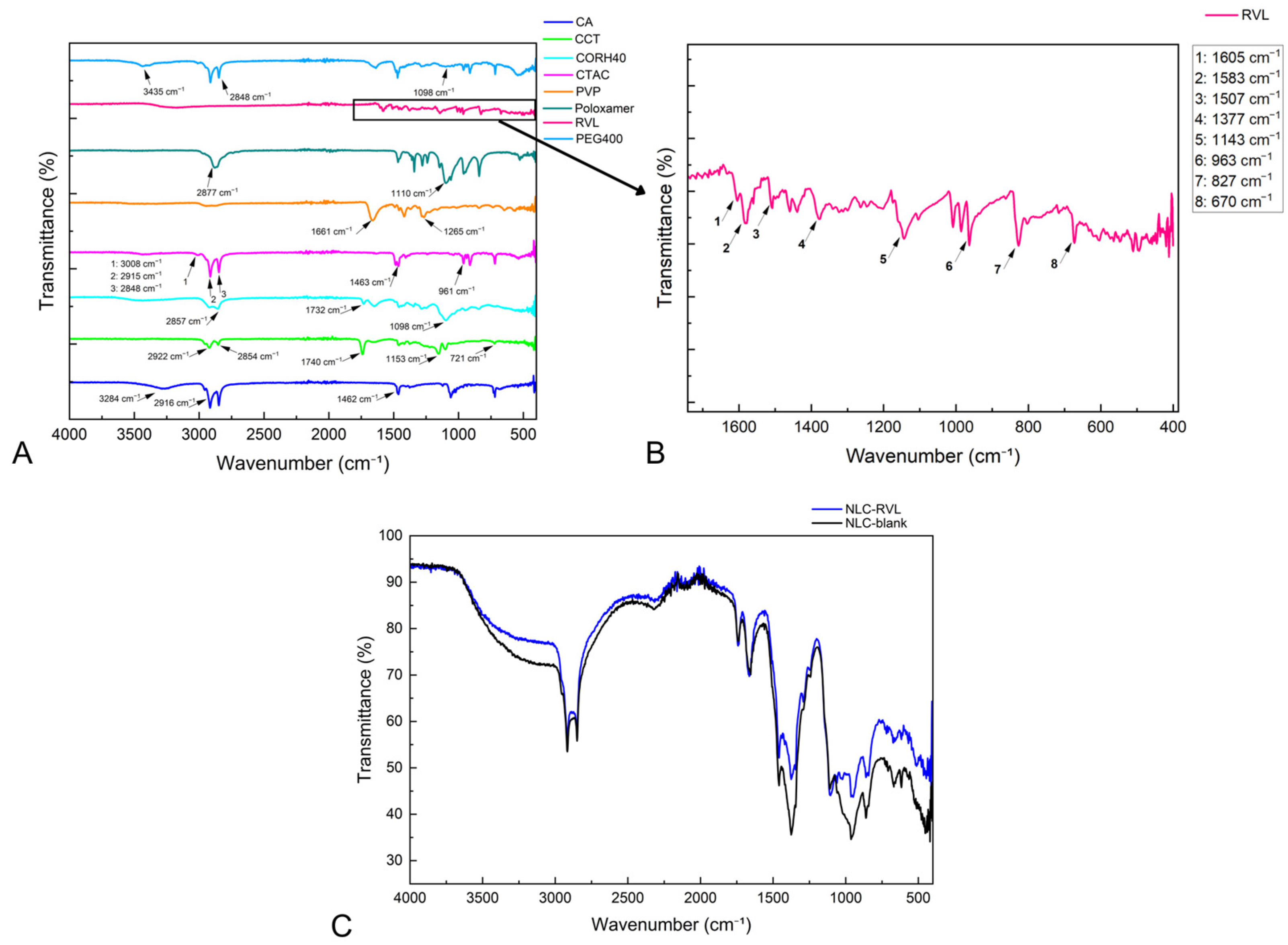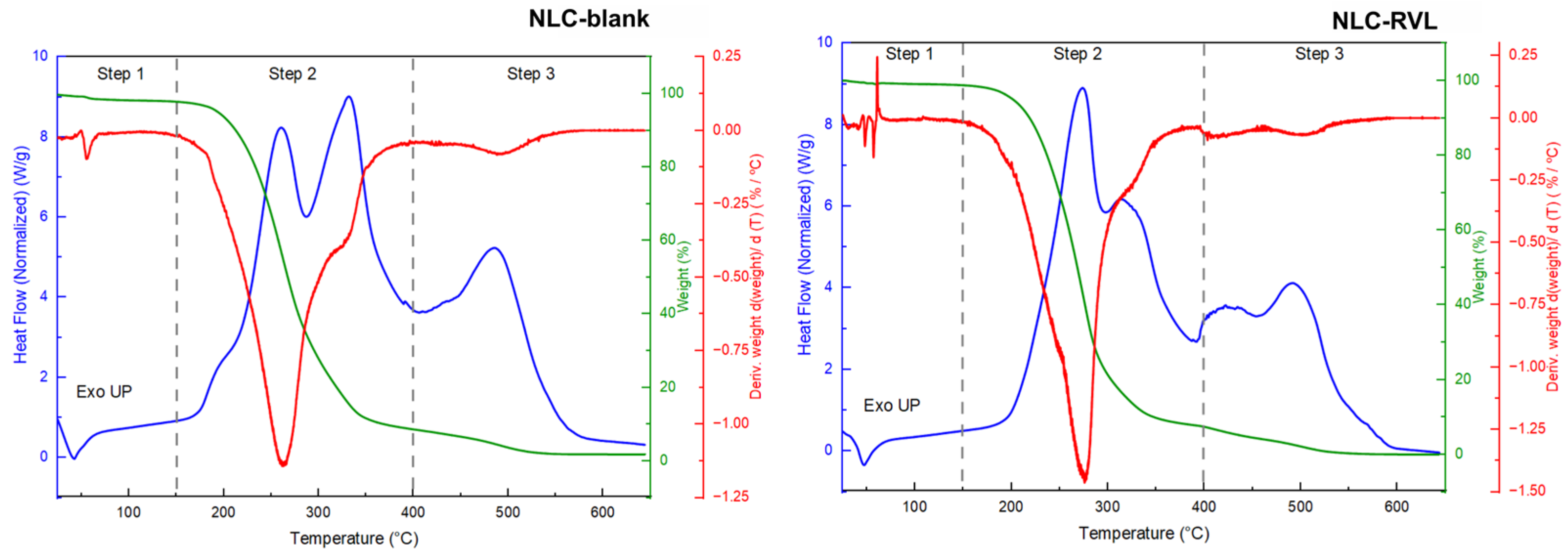 | Steps | Temperature Range (°C) | Parameters | NLC-Blank | NLC-RVL |