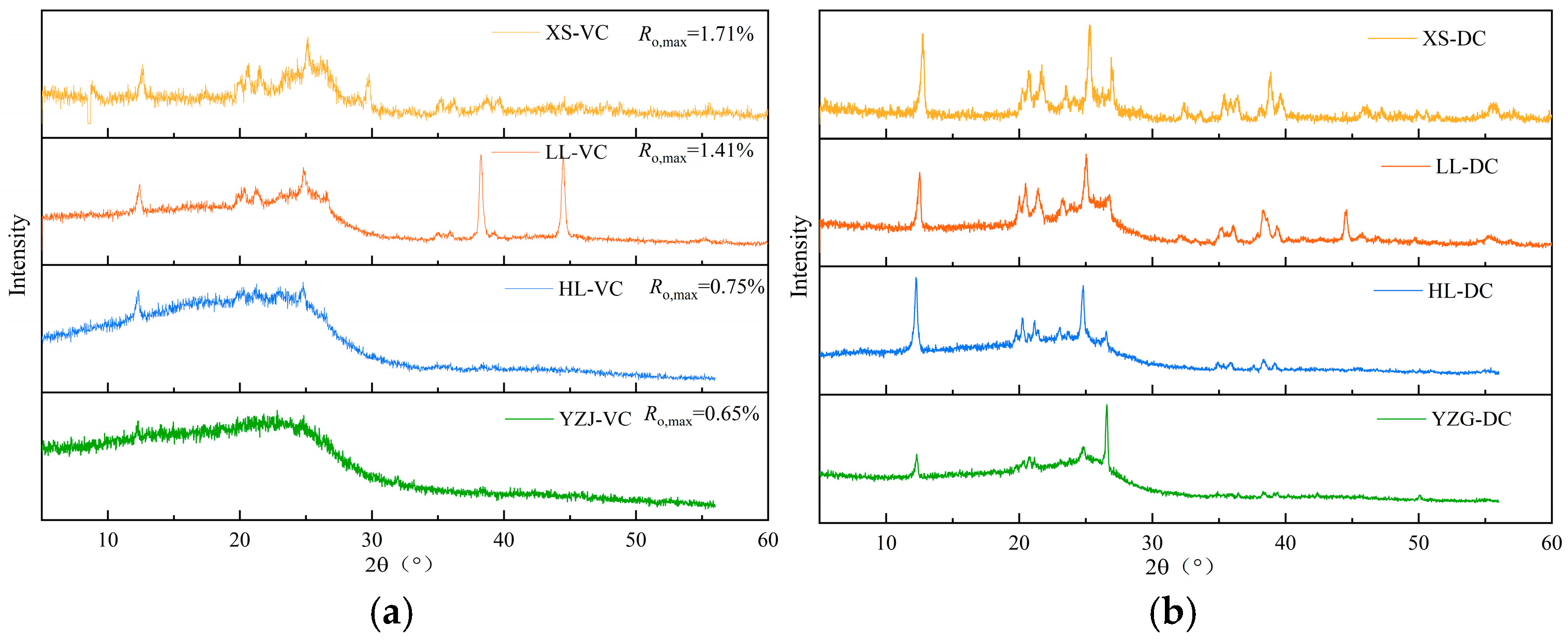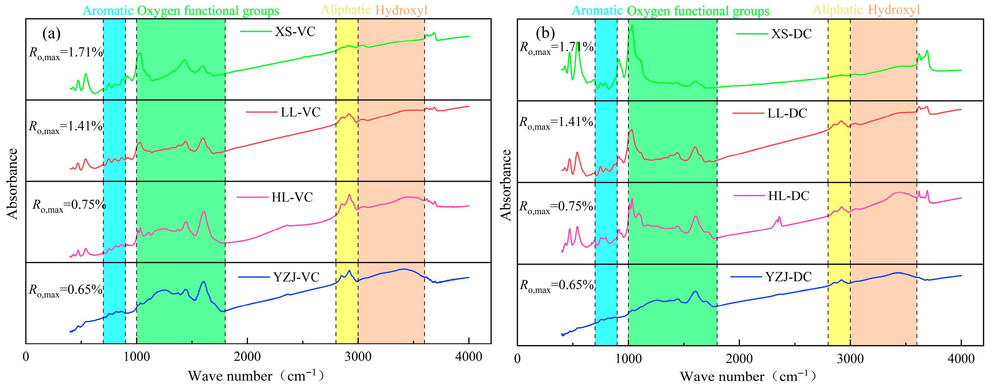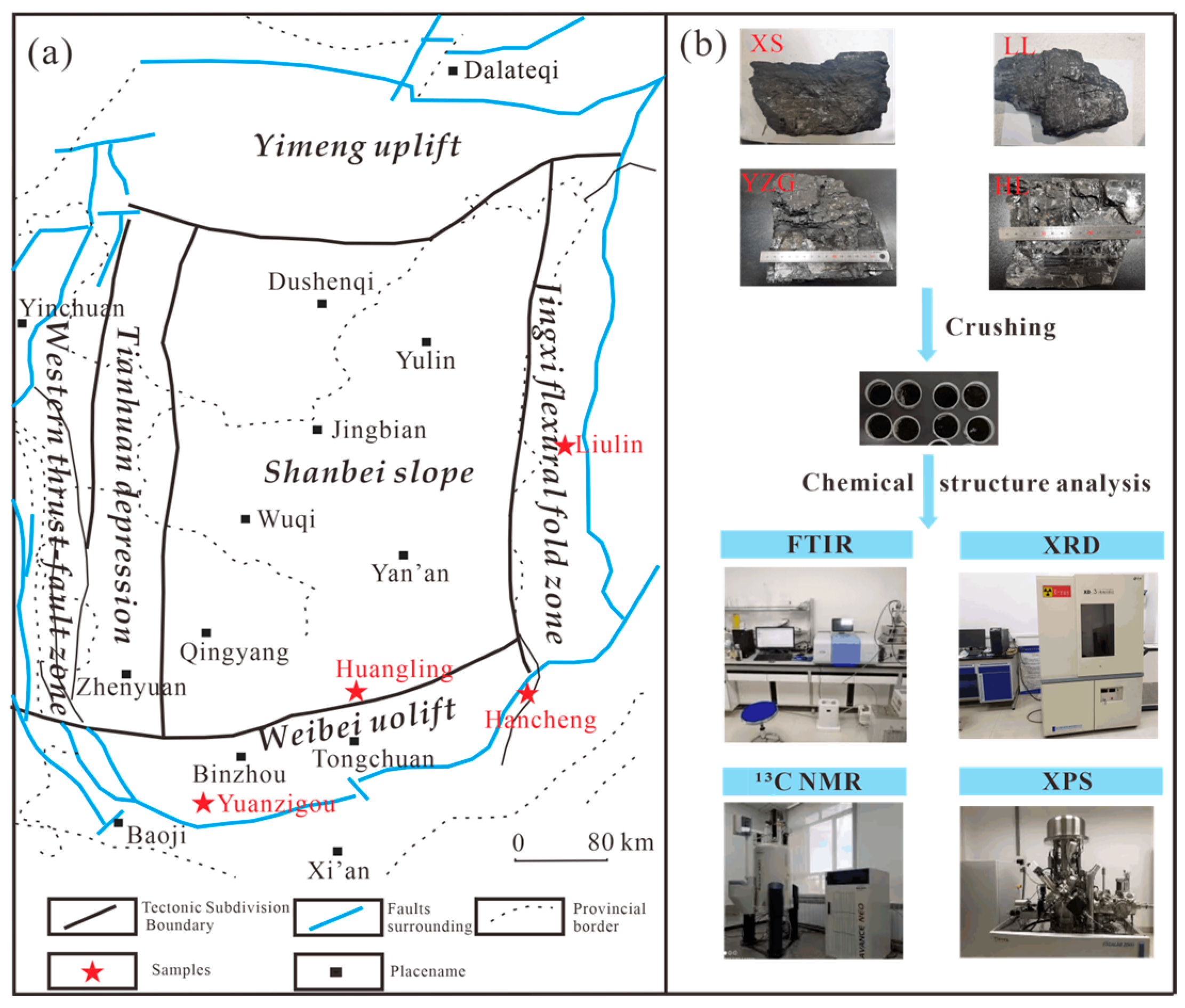 - Bin, L.; Wei, Z.; Xie, Z.H.; Chen, X.J.; Yong, C. FTIR and XRD microscopic characterisation of coal samples with different degrees of metamorphism. J. Mol. Struct. 2024, 1309, 138270. [Google Scholar] [CrossRef]