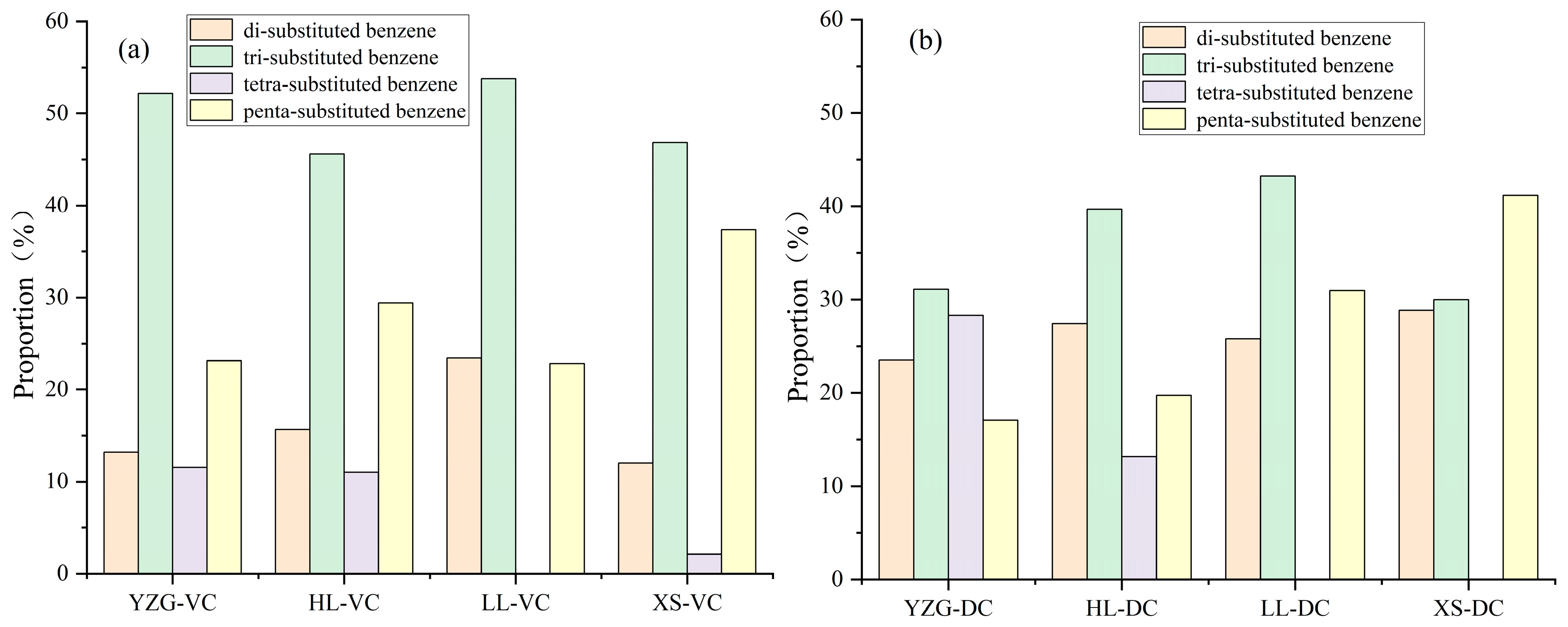 - Vitrain predominantly exhibits trisubstitution, with trisubstituted aromatics comprising a larger proportion than in durain. In contrast, durain transitions from trisubstitution to pentasubstitution. Among oxygen functional groups, C–O bonds are the most abundant, while C=O and COOH groups are less common. Durain generally contains a higher concentration of oxygen functional groups compared to vitrain. The CH2/CH3 ratio in vitrain is consistently higher than in durain. Durain also displays greater aromaticity, higher condensation, and increased aromatic carbon content, suggesting that vitrain contains longer alkyl side chains, while durain is characterized by more extensively developed aromatic structures.