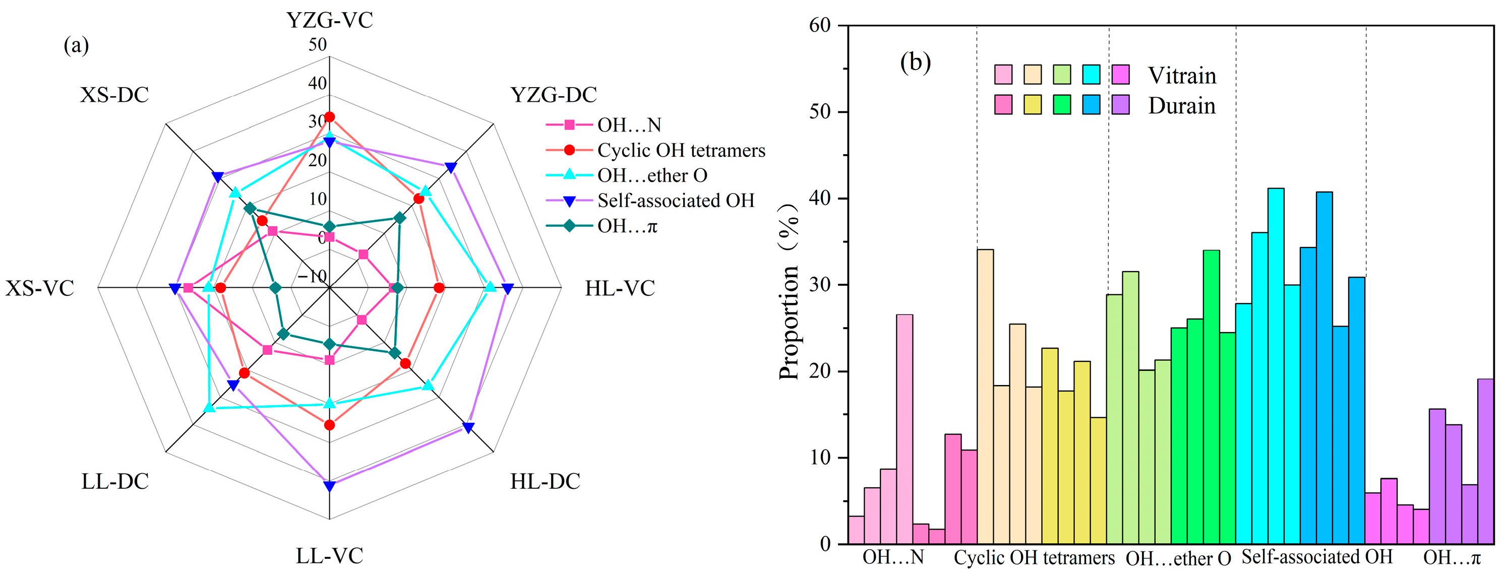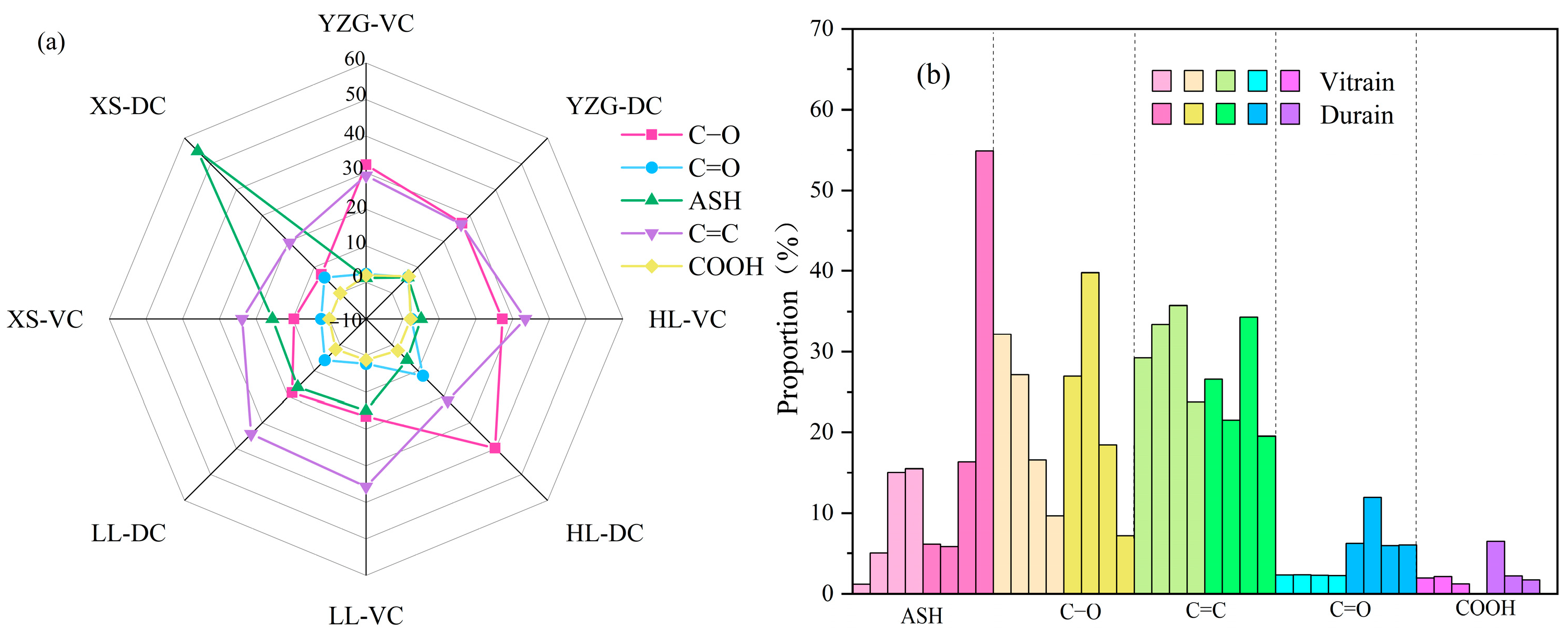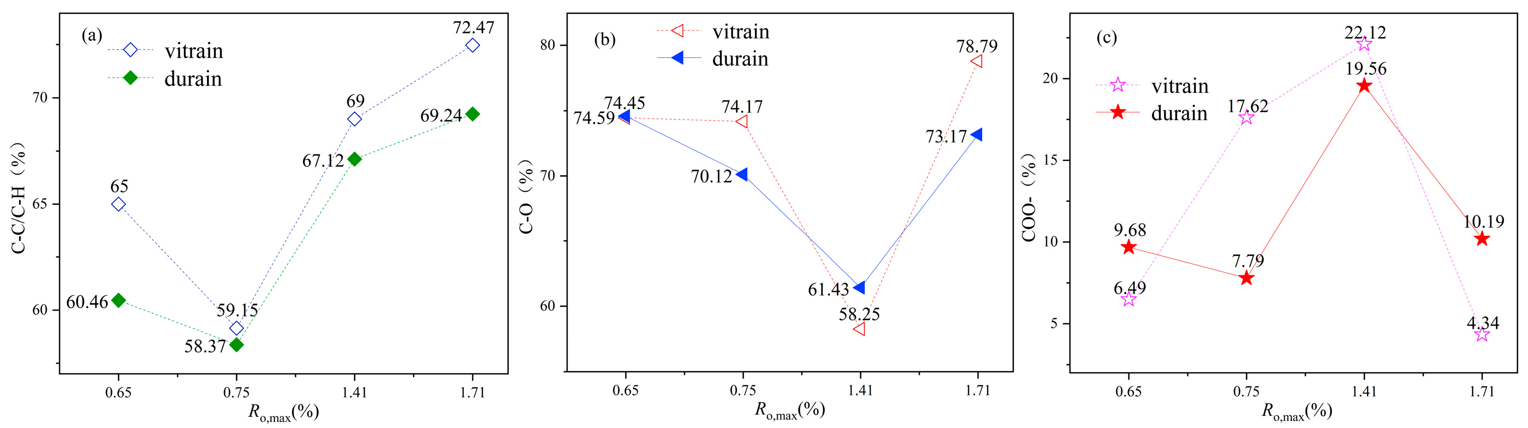 - The X-ray photoelectron spectroscopy (XPS) analysis of carbon (C), nitrogen (N), and oxygen (O) revealed that carbon predominantly exists in C-C/C-H bonding configurations, followed by C-O groups, with carboxyl groups (–COOH) being the least abundant. Notably, the content of C-C/C-H bonds in durain is typically lower than that in vitrain.