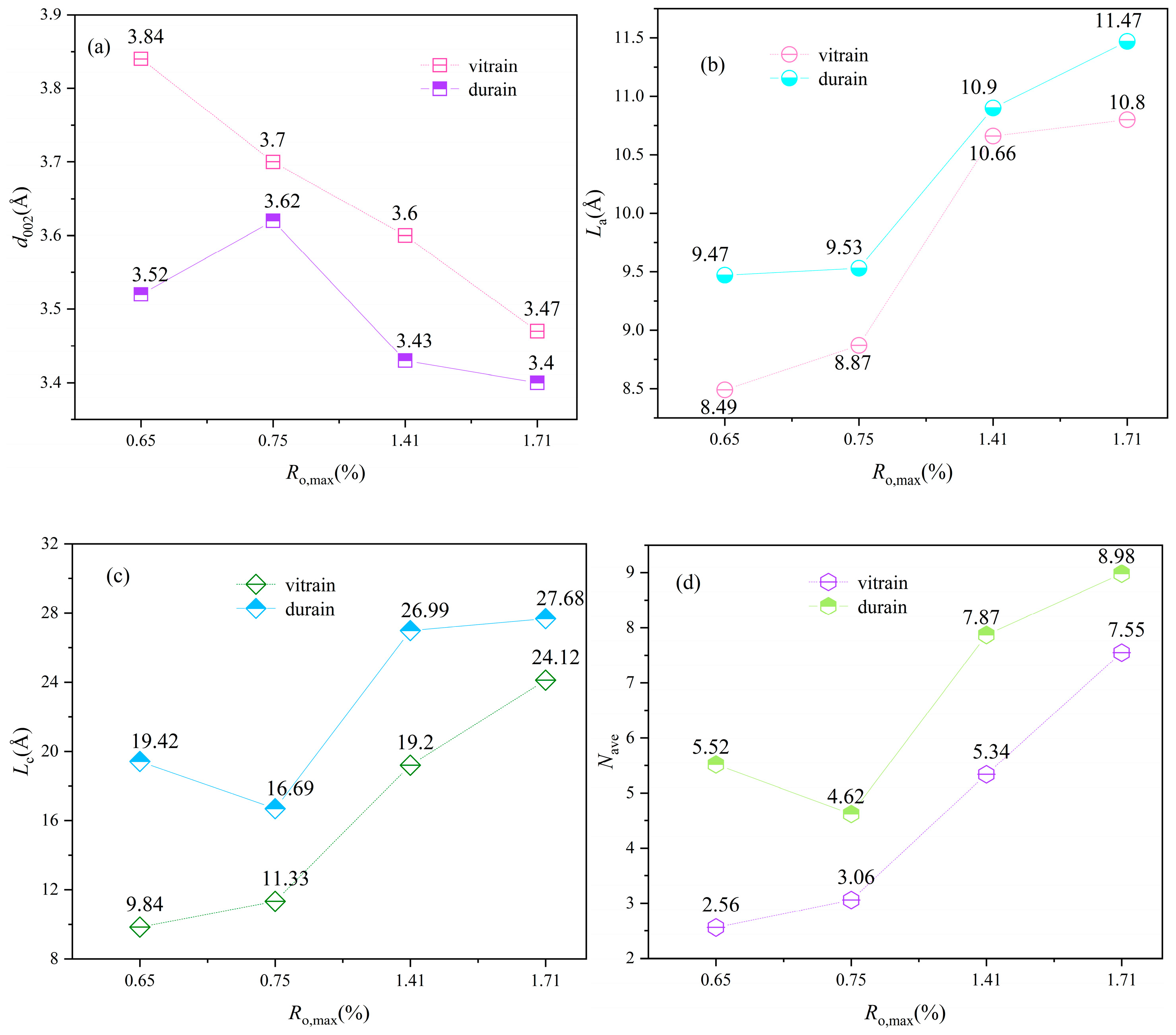 - The d002 size of the vitrain decreased from 3.82 to 3.47, while that of the durain reduced from 3.52 to 3.40. Both exhibited a progressive decline, with the vitrain showing a more pronounced reduction compared to the durain. These findings suggest that the lateral extension of the microcrystalline structure in durain is more developed, indicative of a denser network of molecular interactions and tighter interconnections.