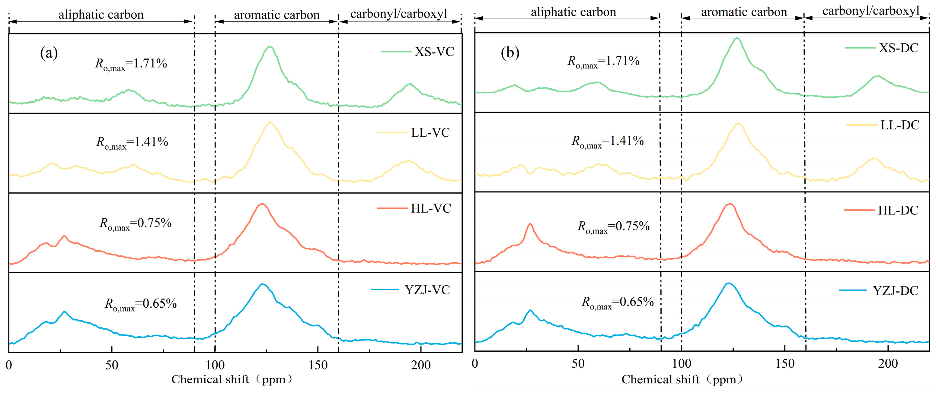 - Lv, T.; Fang, M.X.; Zeng, X.; Yan, J.Q.; Huang, Y.; Cen, J.M. Carbon Structure of Coal from the CP/MAS 13C NMR Spectra: Effect of Contact Time and Potential Quantitative Modification. Energy Fuels 2024, 38, 3740–3754. [Google Scholar] [CrossRef]