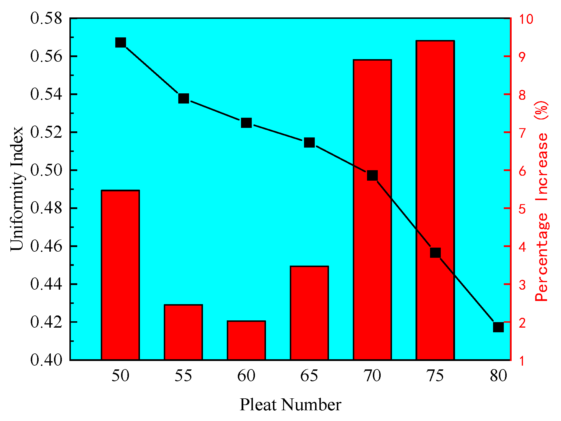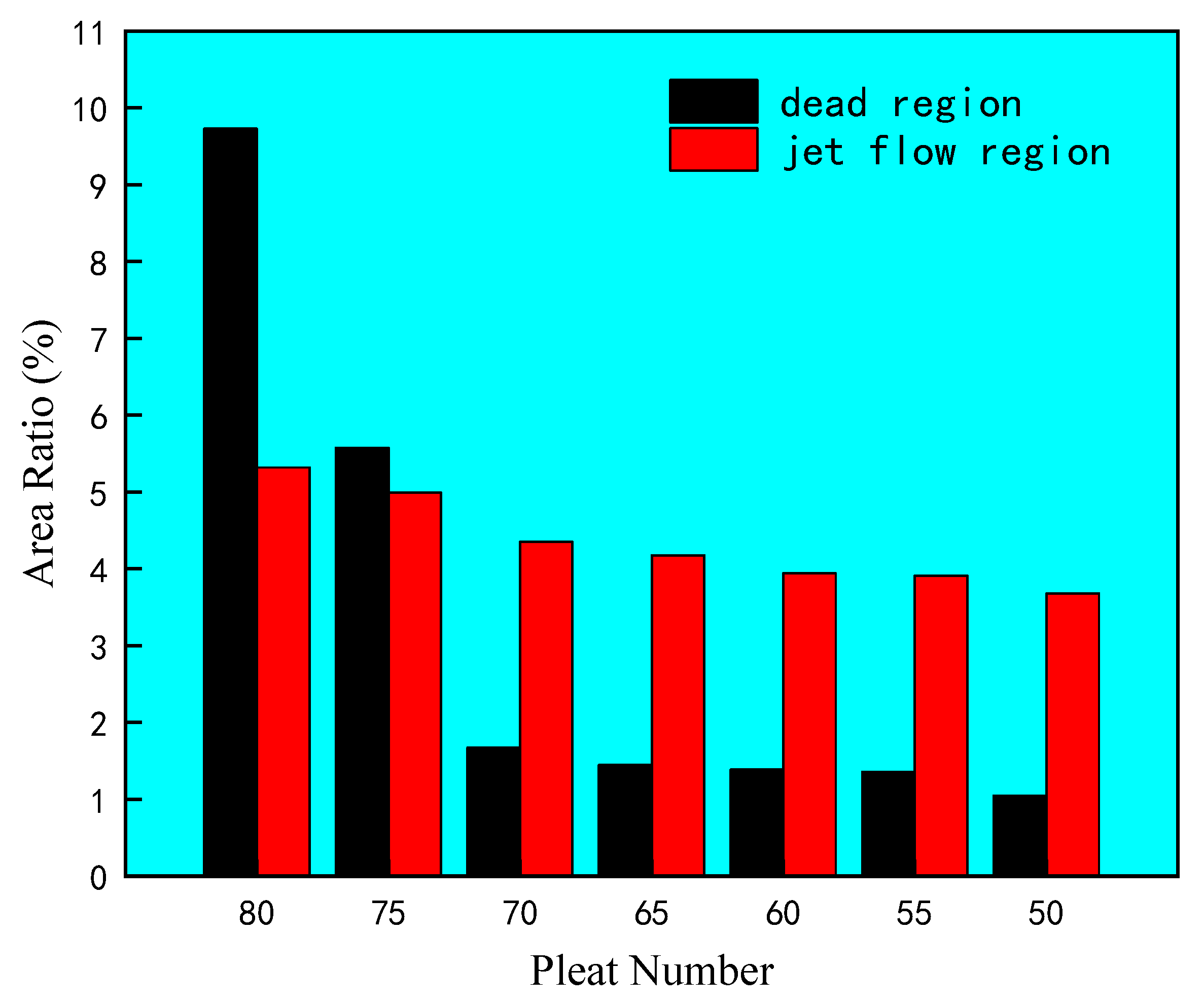 - The pressure drop increases monotonically with increasing pleat number, and higher pleat numbers show greater sensitivity to resistance changes. Flow uniformity follows a distinct threshold effect with the increase of pleat number: when the pleat number is relatively small, the deterioration of uniformity is gradual, and no extensive dead zones are formed, maintaining high media utilization; beyond a certain threshold, narrowed inter-pleat spacing induces intense jet flow and expanded dead zones, leading to a sharp decline in uniformity and wasted filtration area.