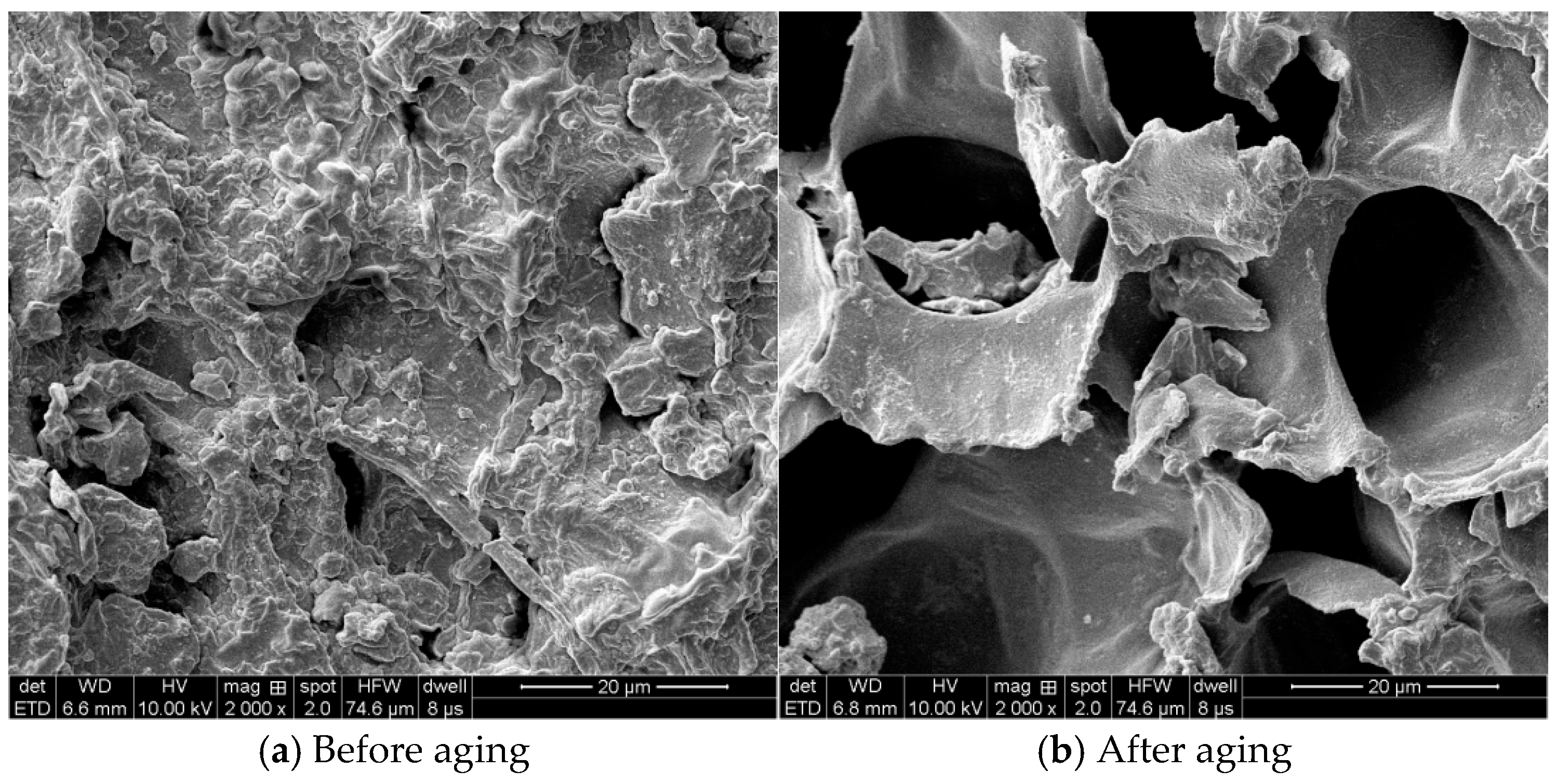Figure 12 shows that after ultra-high-temperature aging, the high-temperature sealing layer maintains an intact structure with excellent thermal resistance. Before aging, the plugging layer exhibits a dense structure, with different materials (particles, fibers, and flaky materials) tightly integrated and minimal porosity. After aging, the overall structure of the plugging layer remains intact, without large cracks or voids caused by material degradation. This demonstrates that the selected materials can maintain a stable microstructure even after aging at 240 °C, thereby ensuring their plugging performance.